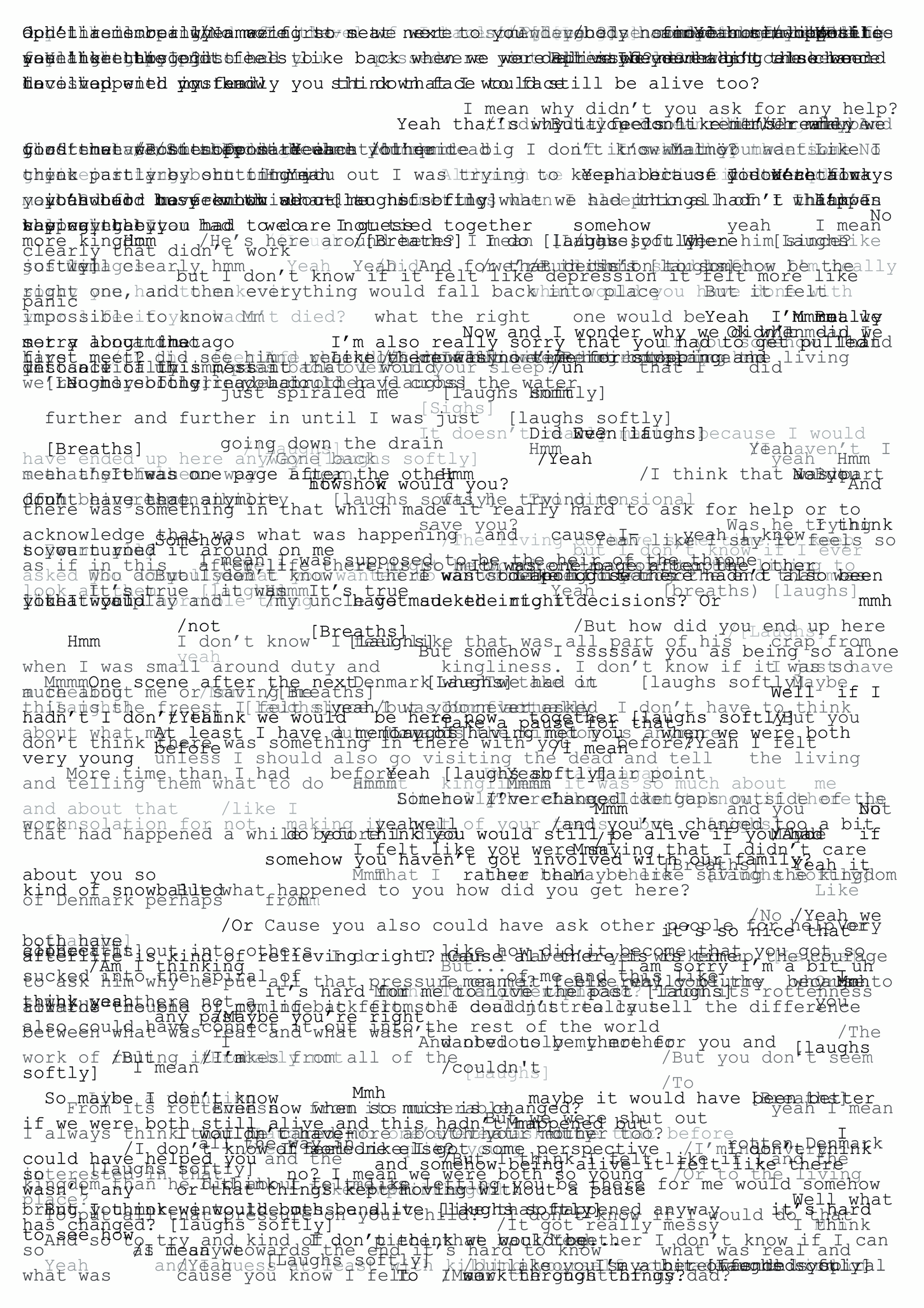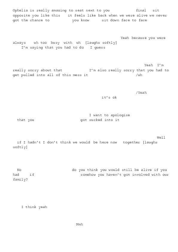 The conversation in the video dates back to the first series of staged situations for the project. The invitation was to improvise a fictional conversation between Hamlet and Ophelia. The conversations where initially video recorded for documentation purposes with a fix video camera.