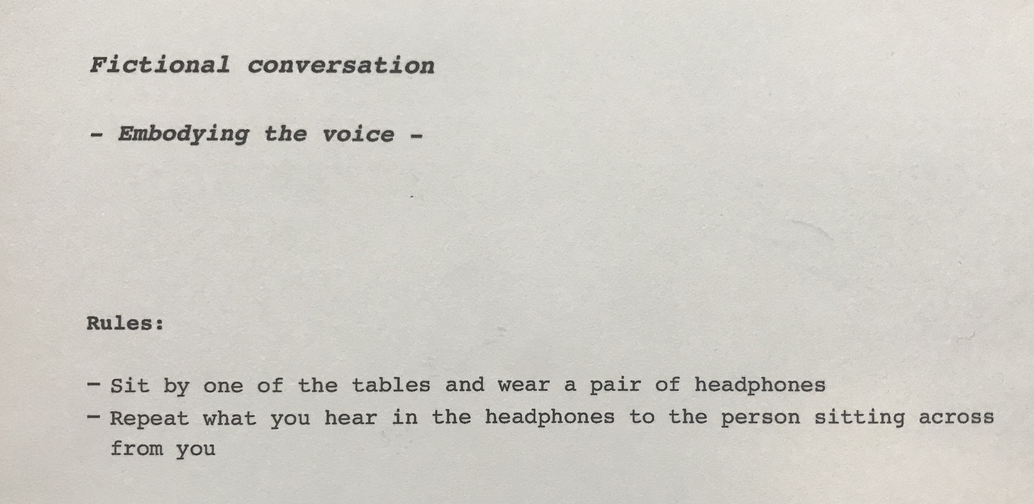 In the next days I decided to formalise into a task what Peter had done, and experiment with this other mode of interaction between, in this case, a recorded voice, one’s own interpretation and the other participant.