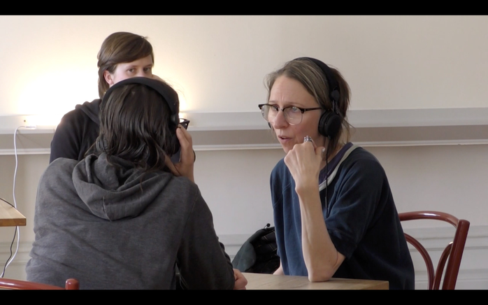 For the presentation I used the recorded audio-material to experiment with another type of staged situation. The two voices of the converser have been separated, so that one pair of headphone plays only one of the two voices. My intention is to experiment with people sitting in front of each other while listening to the incomplete conversation. What relations and imaginaries are produce by the mediated and unfulfilled encounter? If the conversation’s ‘meaning’ is created by the two voices, what gets lost in the separation of the voices? Does one isolated voice clearly carry the interaction that co-produced it? What desires are triggered by its incompleteness, by the gap and by the absence?