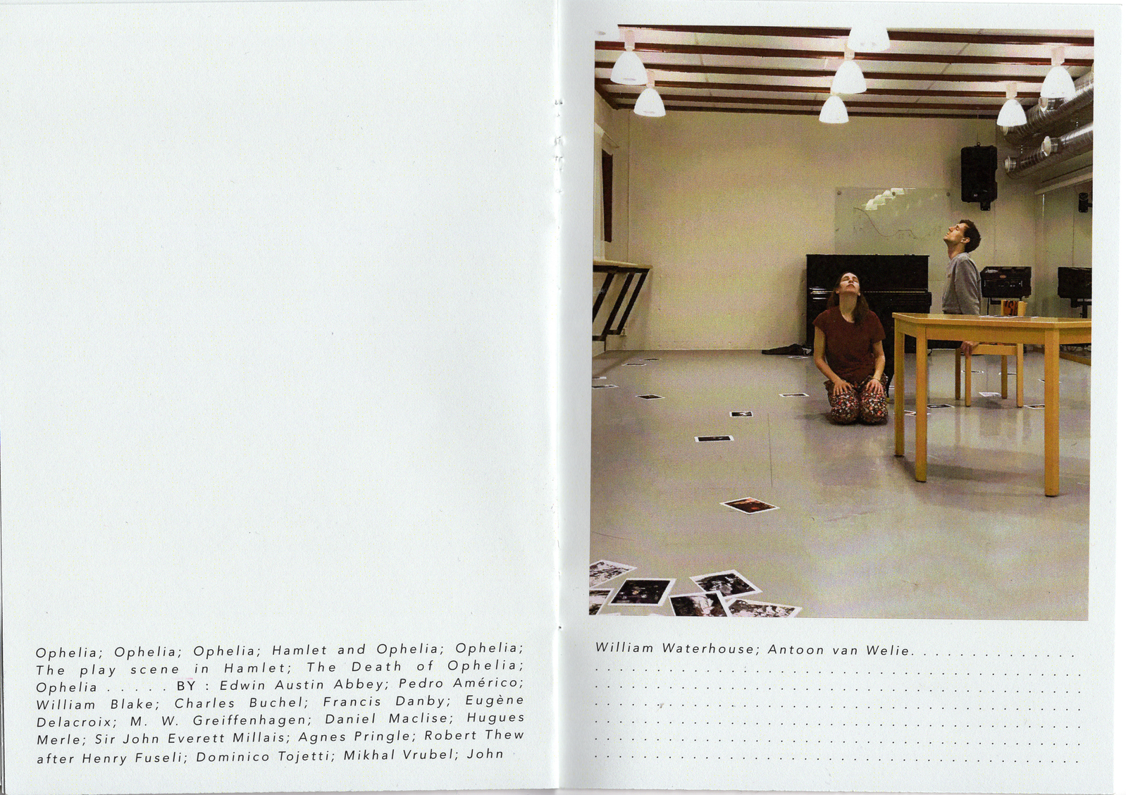The performance of Alice and Benny consists in telling stories based on personal memories and anecdotes, while reproducing gestures derived from a selection of historical paintings of Hamlet and Ophelia. We experiment with the juxtaposition of these materials, the personal and subjective experiences with the reproduction of images, and with different modes of relation to the public. We observed what kind of dialogues are created by these juxtapositions, how they act towards each other, how they narrate each other, how they merge or oppose each other, and how the production of affects and meanings is based on the social.