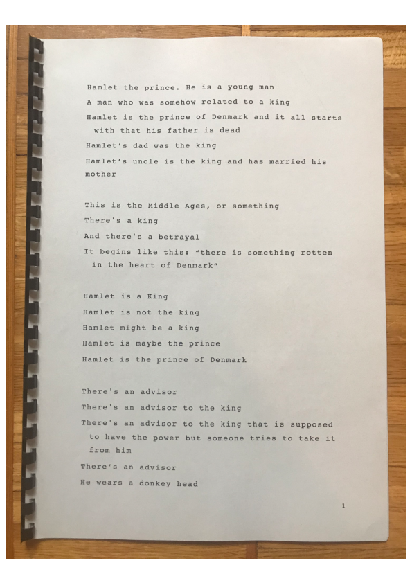 Fictioning Hamlet: Dialogues and Diffractions is a choreographed environment. It includes materials and practices developed along a research process that I embarked on in the spring of 2018: surprised by the sense of shame I felt when realising I did not know the story of Hamlet, I began dealing with questions relating to the power dynamics between dominant narratives and individual imaginaries. I decided to work with Hamlet, not to re-write or reinterpret the original story, but rather to trigger a collective recollection through the things we believe we remember.