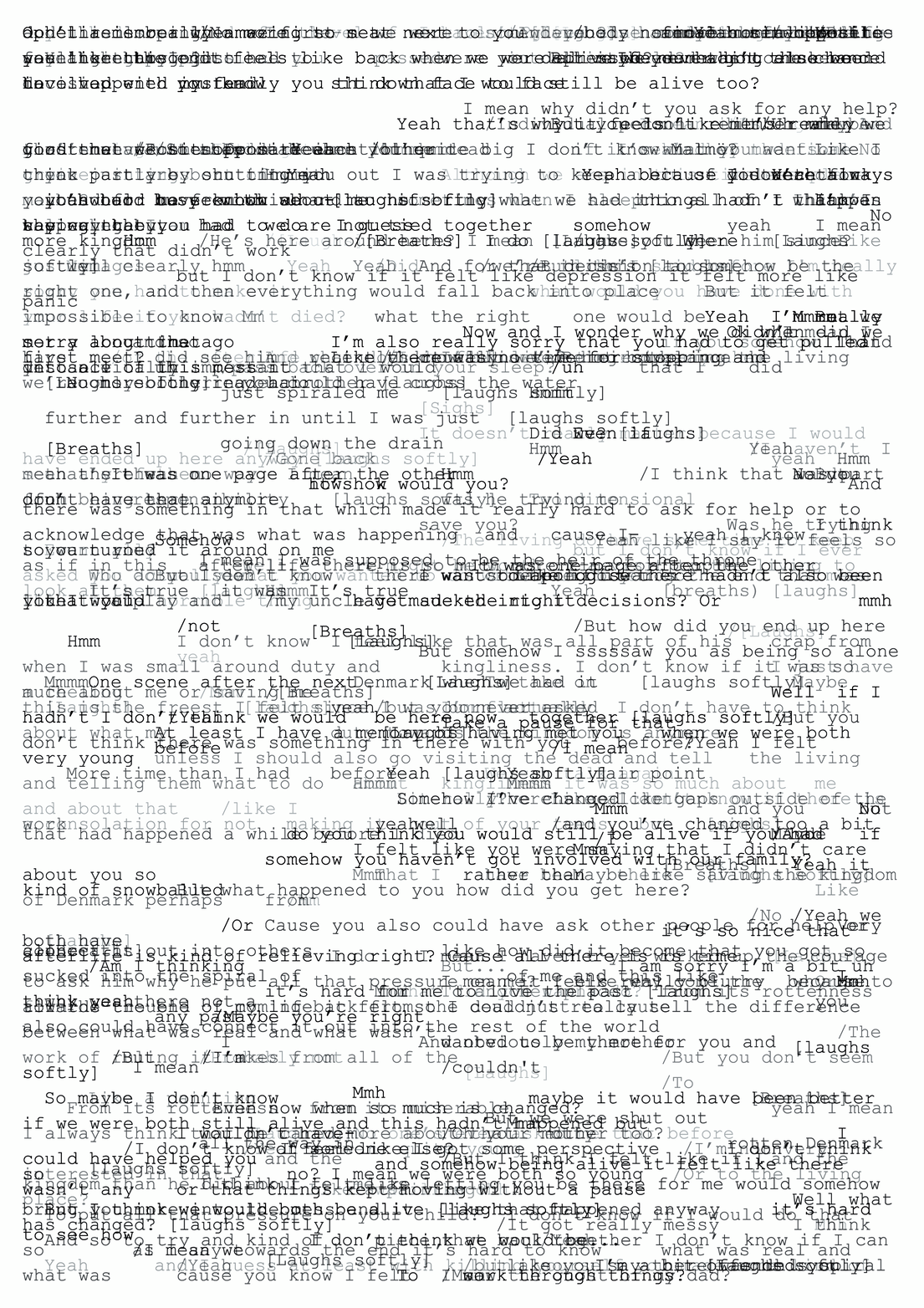 These conversations are the result of an invitation to take part in a role-game. The volunteer participants choose one character between Hamlet and Ophelia, and one of the proposed topics for a conversation. Through this staged situation I have been observing how the borders of whom is talking can become blurry and undefined: is it the voice of the character, of the person, of the person enacting? What interests me is how the game can produce a subjectivity that arises from the navigation between the personal and fictional character. Can the constant intra-movement between different voices, bodies and imaginaries become fluid and manifest? What spaces, imaginaries, bodies and subjectivities are produced through the multiple intra-action?