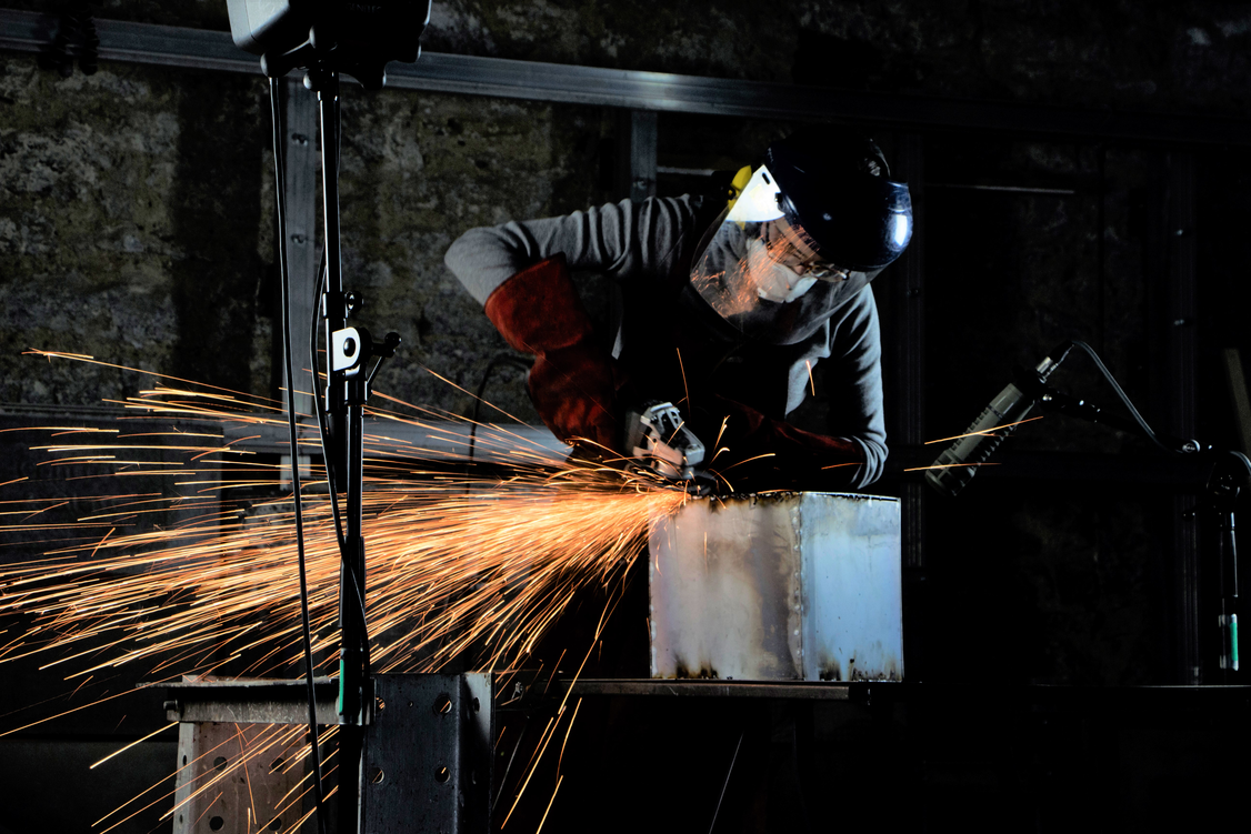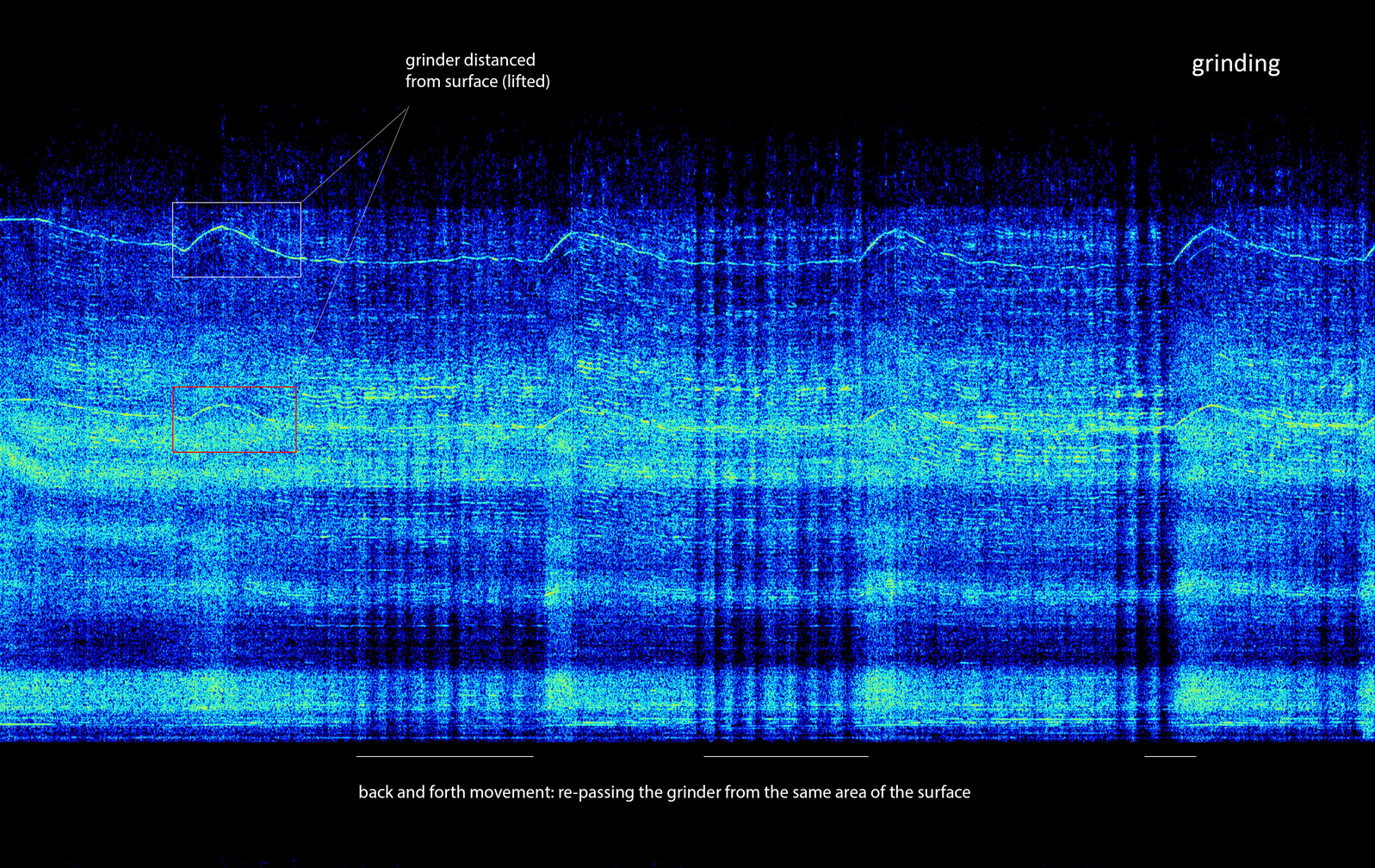 Concerning the steel making process, two main actions can be distinguished: welding and grinding. The action of welding included holding pieces of steel together, executing the welds and adjusting the pieces as the object was being made. The sound of welding involved a pause “between each sound of welding […] while rotating [the object], which creates a type of rhythmic pattern” (Panourgia, 2016, p.192). As observed in the spectrogram analysis, the rhythmic pattern varies in duration, which reflects the sub-action of adjusting and the interdependent relationship of sound with the physical material manipulation involved in co-composition. The sound of welding is characterised by moments of high intensity resulting from an accumulation of energy over short periods of time, which resemble to small explosions. Welding’s sonic qualities are closer to a percussive sound. Changing the rhythm of welding by transforming the intervals between each weld into shorter ones for example, would produce a denser and more intense sound. Regarding the making, continuous welds would signify a faster process with less time for rotating or thinking about the object’s form. Following this, sounds of the making mirror the time scale of sculpture and their transformation could, therefore, affect the sculptural outcome.