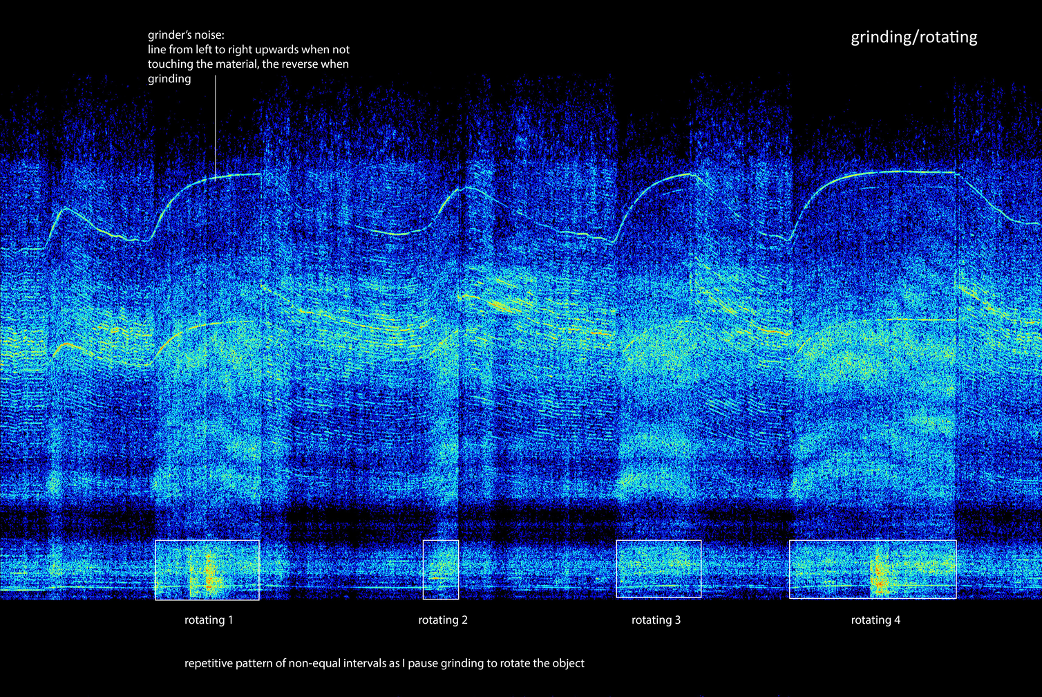 The action of grinding is happening with a back and forth movement for cutting or removing extra material, while rotating the object. Grinding sounds are more sustained than the ones produced by welding. Pauses between sounds happen less frequently, and they concern adjusting the grinder on the surface of the object while deciding on the continuation of the process. Grinding is more intense than welding and energy is articulated in longer periods of time. The sound of grinding presents waves of energy including subtle variations of their spectral content according to the position of the grinder in relation to the sculptural object. Distancing the grinder from the object had as consequence the loss of contact with the material and the change of its sound to less dense and of a higher frequency. This action produced an effect of ‘grinding in the air’, which was executed for the sake of the sonic output and added a performative quality: it allowed more time between grinding and rotating the object, and a pause in making.