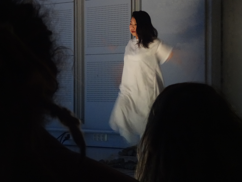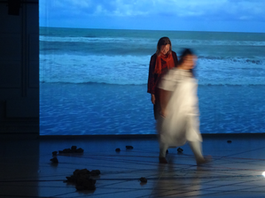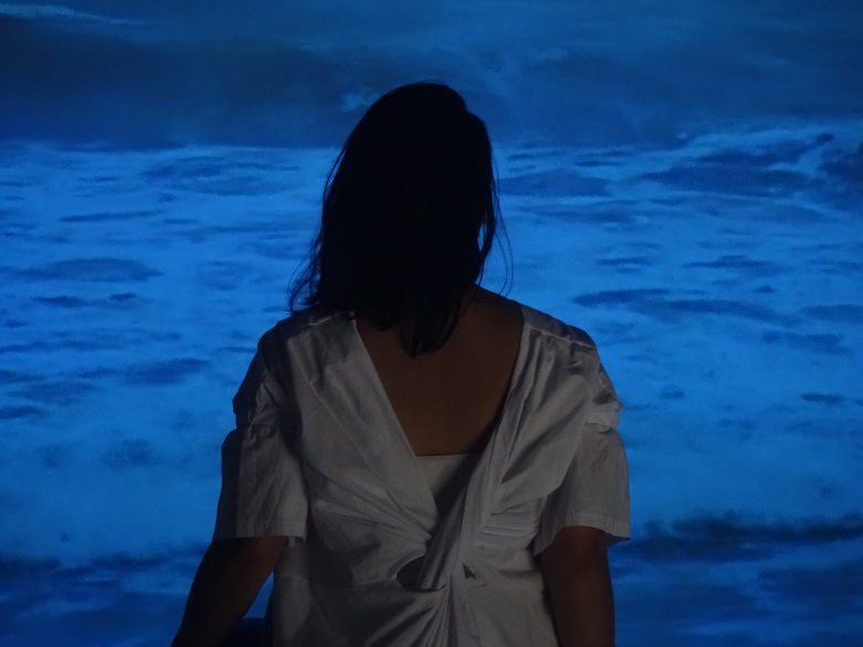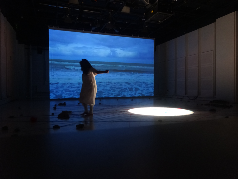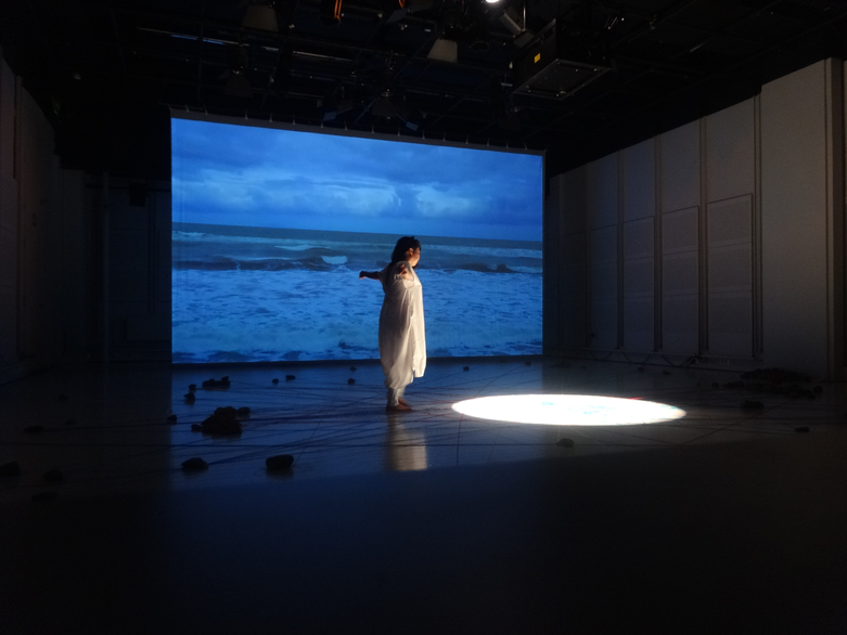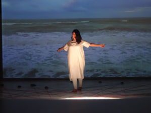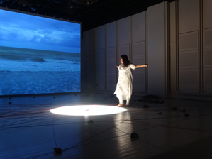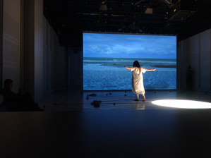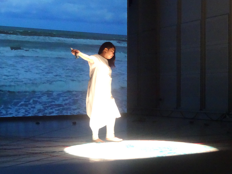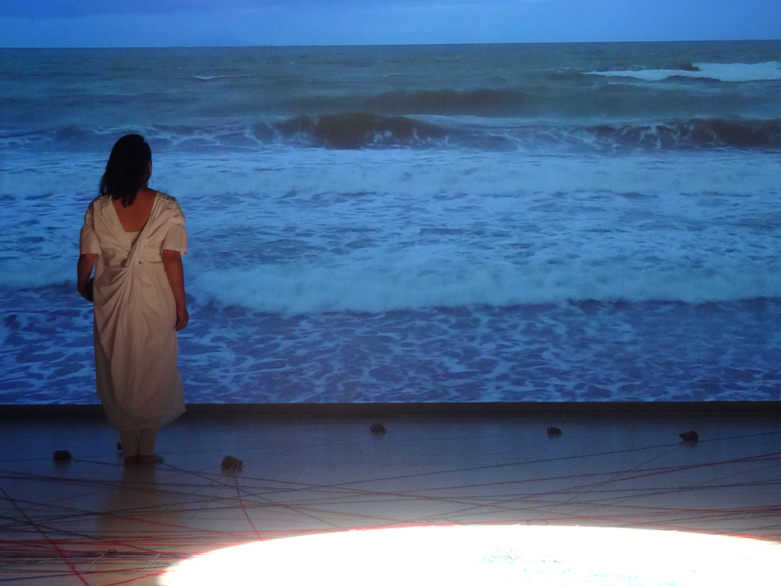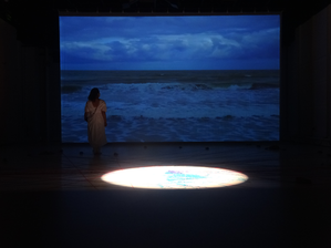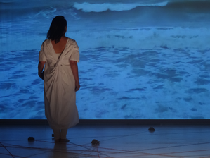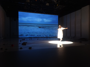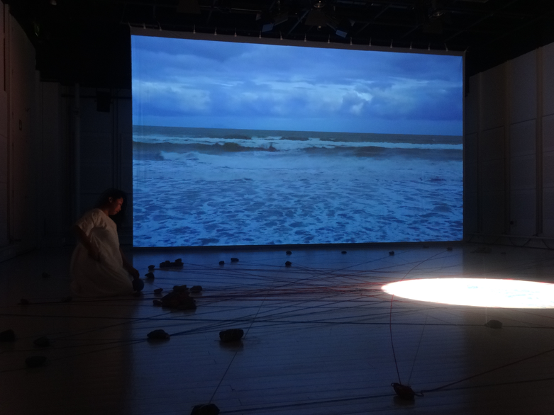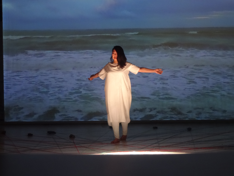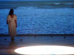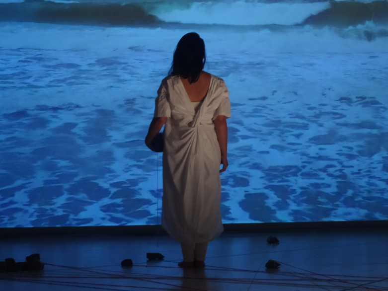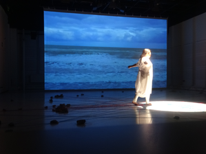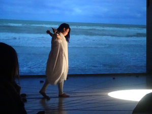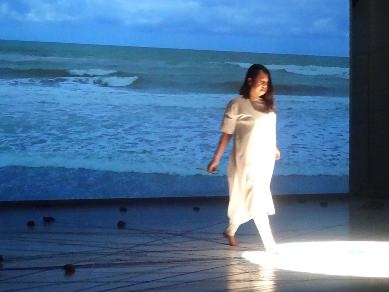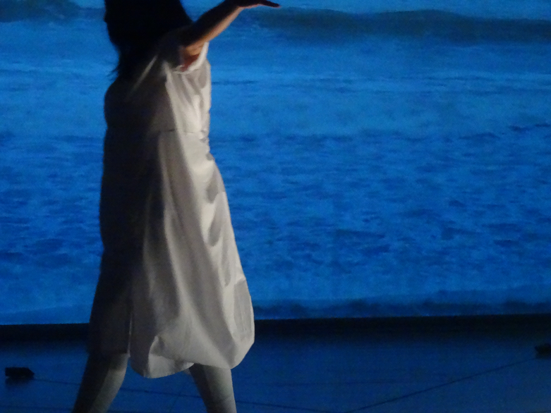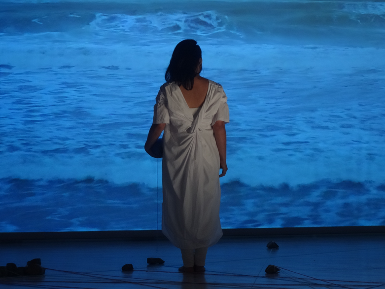 In this durational piece, one could smell in the air her grief, could witness her re-tracing her solitude and navigating her sorrows. In Elegy #8, the Pacific Ocean, the Pacific Ocean may not be the real thing but it was an augmented reality to emphasize the absurdity or insubstantiality of reality. But what is the dramaturgy of the digital in relation to performance?