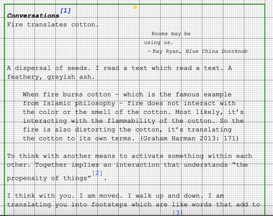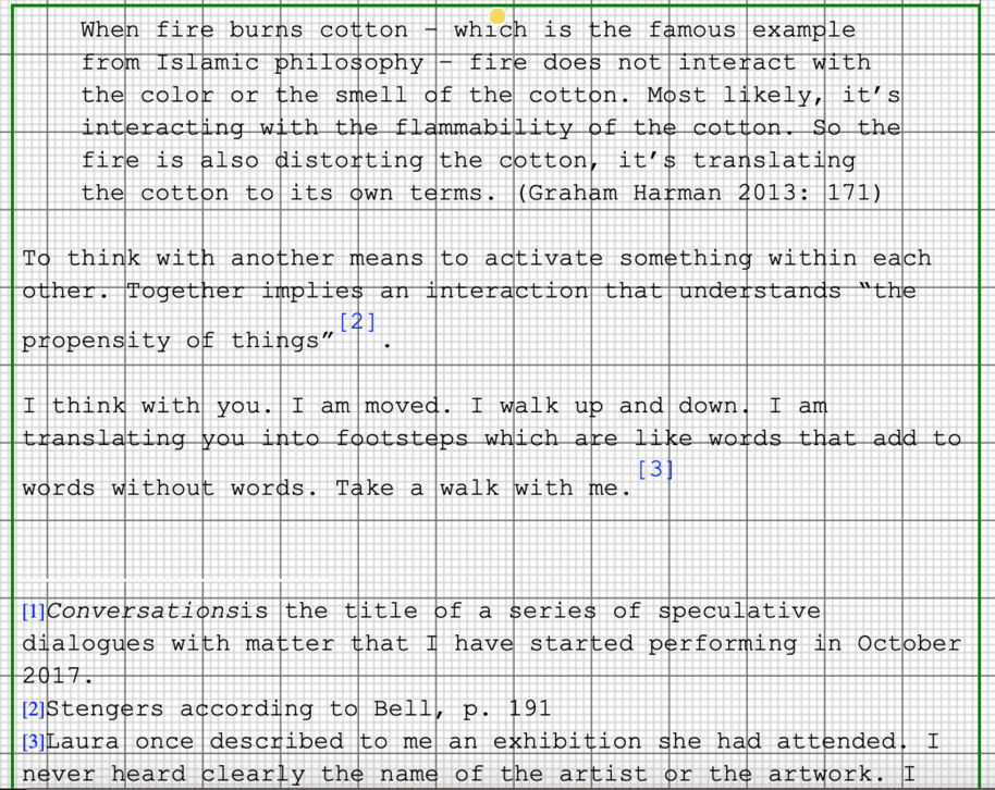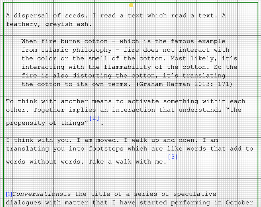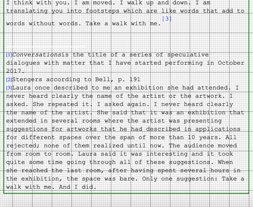 Disclaimer: This writing is obscure because my mind is obscure since I fail to grasp “the role of convention in constituting the truth” . Error happens to find a space here. This exposition performs an instance of anxiety before a definition. A space that appears empty but lacks emptiness, a μηspace (mespace). This space is purely fictional and utterly excessive. A space that is not pointing a way but translates something into existence. This writing aspires to move away from a formulation of theory and towards an exhaustion of thought. Time is not of the essence to this performance, but its essence is addressed. This exposition may act as an introduction to the concept of μηspace. I use the research catalogue both as a μηspace and as a space for reflection. This is an exposition that records an intense present, offers various points of entry to texts and exercises performing μηspace. It is a space for exploration and for thinking together.