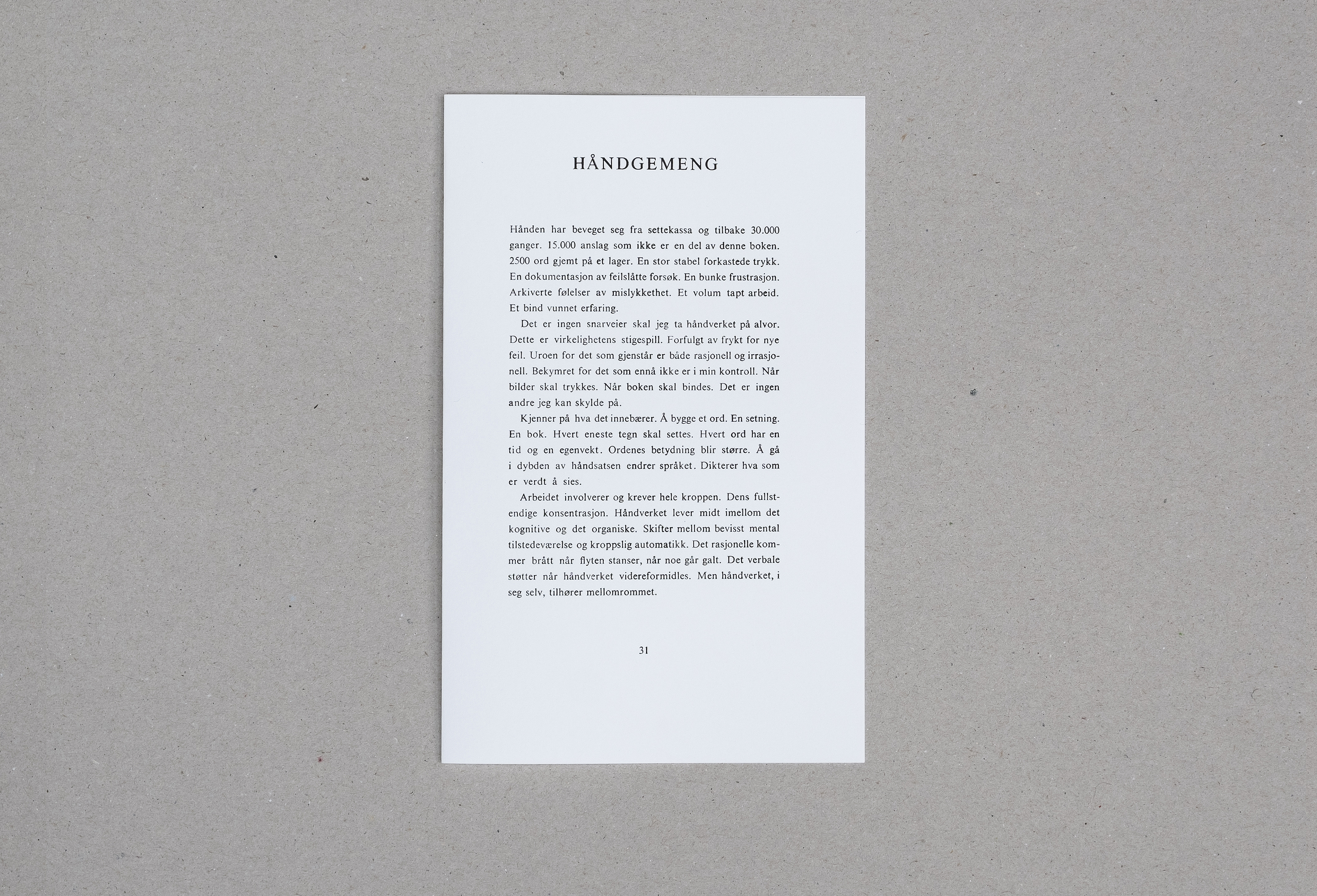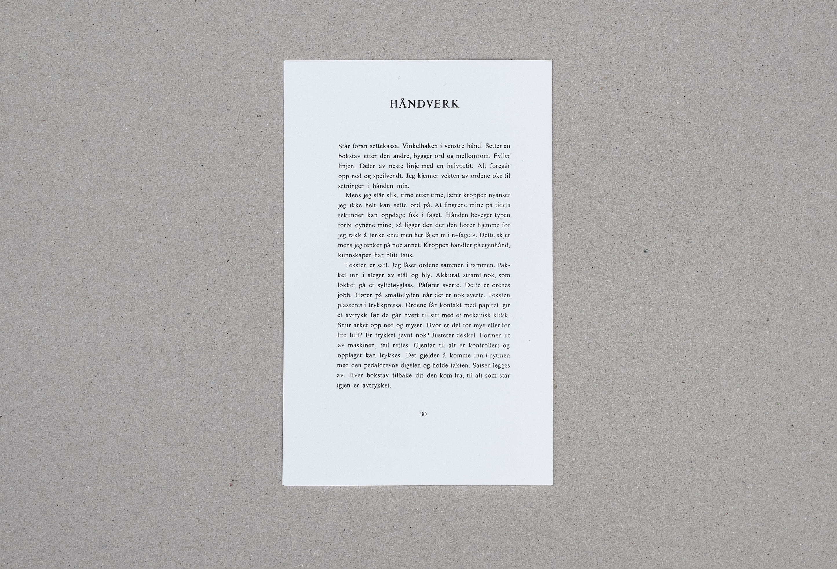 A Printing Press of One’s Own (En egen trykkpresse) is a practical examination of the relationship between art and technique, hand and spirit, thought and printing ink. The project came out of an interest in the printed medium in a digital age. Book printing has been the dominant technology for setting and mass reproducing of the printed word from when Gutenberg popularized the technique in the 1450s, and until well into the 20th century. Thon Knutsen set out to search for a professional position which allowed her to combine an artistic approach to typography and graphic form with her technical insight and historical knowledge of book printing. She found Virginia Woolf. The canonised modernist author and the feminist icon worked in parallel with both her writing as artistic practice and as typesetter and printer in her own private printing press. Through in-depth close reading of Woolf's authorship, seen through the first-hand experience as typesetter and printer, Thon Knutsen has found new ways to read Woolf, and a direction for her own artistic and research-based practice. Thon Knutsen has recreated the short story that Woolf printed in her debut, The Mark on the Wall, in its whole, but with a new aesthetic appearance. She has done this with a method that Thon Knutsen claims must have been used by Woolf; the thought and the writing must have been influenced by the experience of setting and printing as a pendulum between the spirit that writes and the hand that sets.