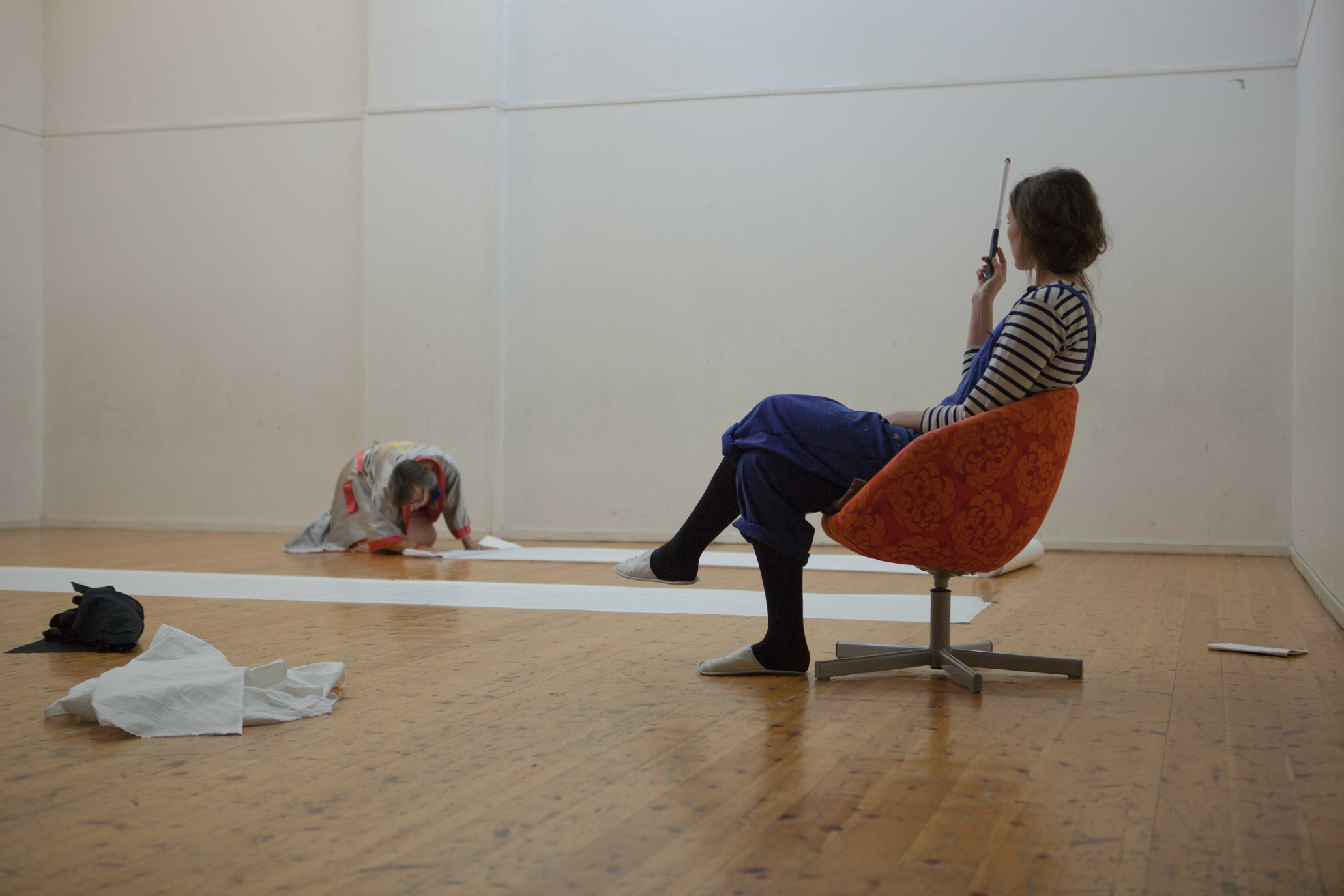 Shah: Beeing a student in art in public space (KHiO) it is interesting to see how we can engage the public or audience with the performance. So, one nice idea that you offered was this setting that the audience actually sit on, the placing of the chairs on the paper. In that way the audience is characters aswell. I wanted to ask you; was it enough to feel engaged with the piece, or are you feeling confused? For me, its interesting to know how you could have felt more engaged or active.
