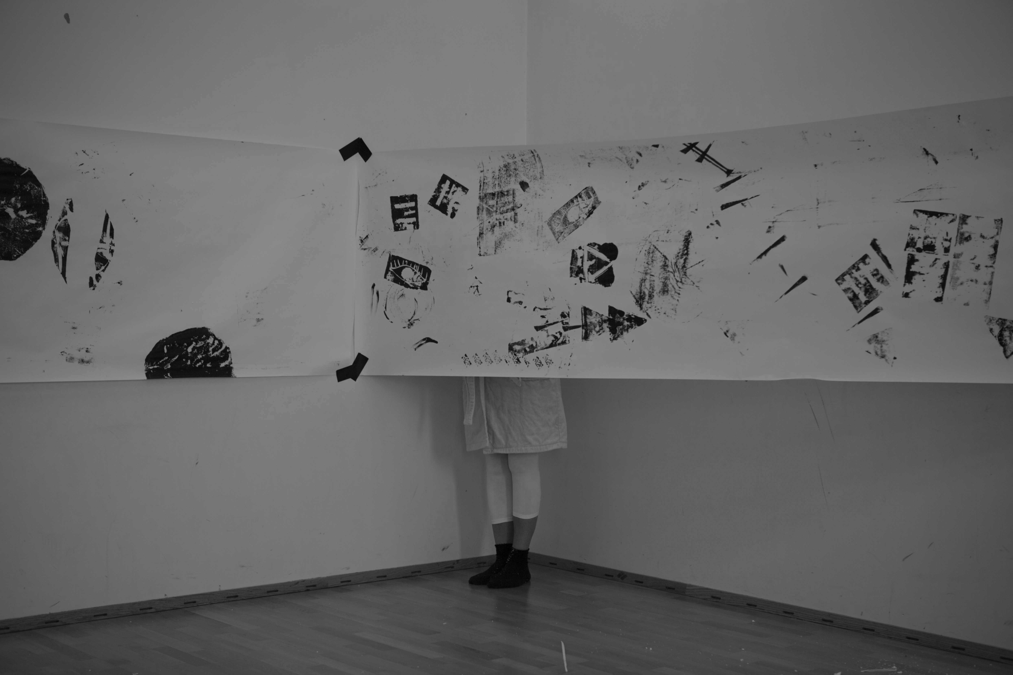 Laima: We were discussing a lot. She (Yendini) represented the creativity from the text, which is a stream of consciousness and therefor drifting like a reflection – You see the mark from which different characters appear. We are not just sorts, but characters. She (Ane) represents how to fit this text physically, design it in an actual book. I wonder if it was clear — this kind of distinction between the floating and the conventious setting up?