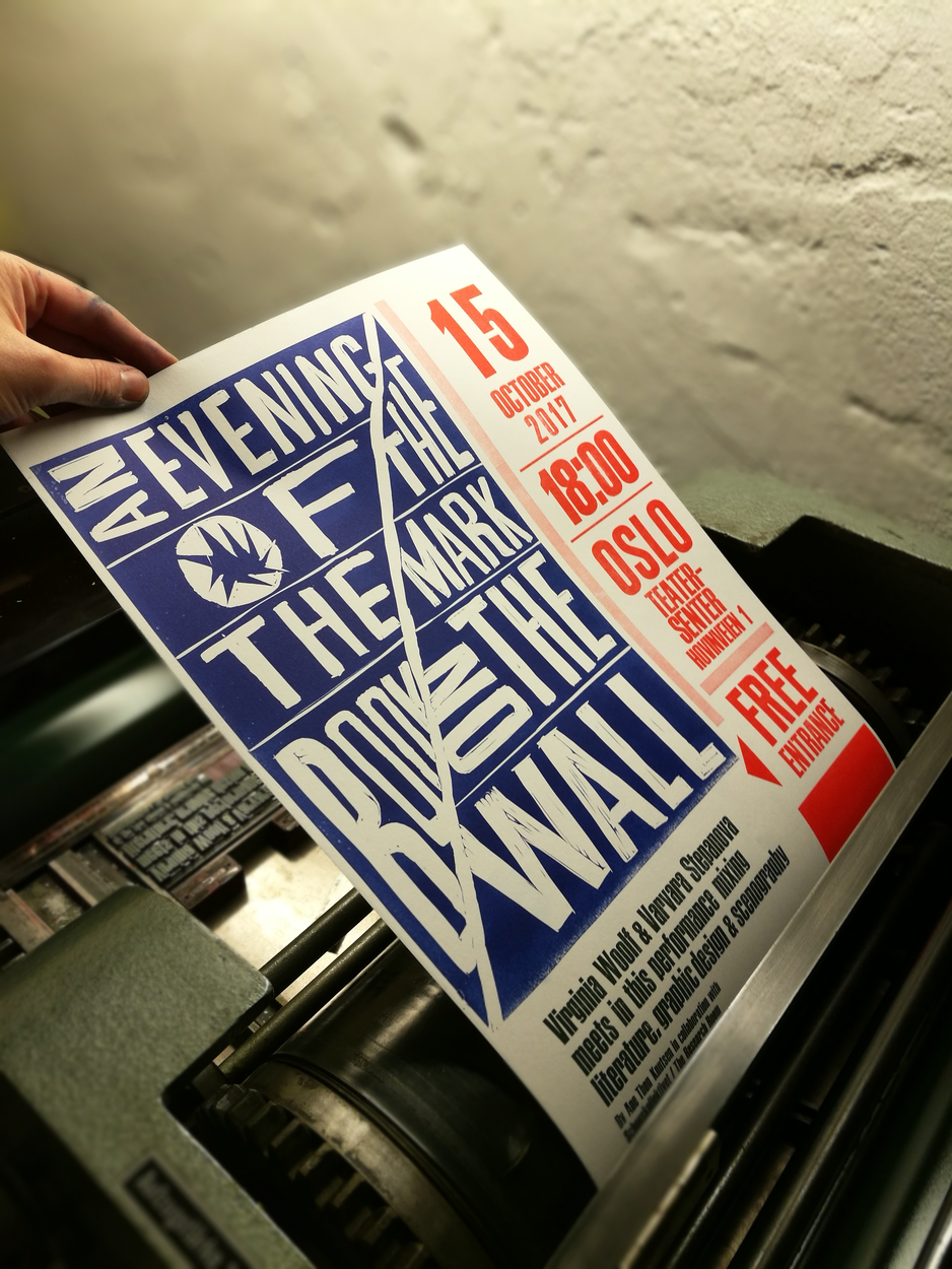 Ane: We have been working on The Mark on The Wall, the first story Virginia Woolf wrote after setting up a printing press of her own. This is the second story she typeset, after setting up her husband Leonards story ‹‹Three Jews››. This is the first time she is a completely free writer, that could publish whatever she wanted. That was our starting point, and we – I – wanted to emphasise the actual process of typesetting in relation to writing, as something going back and forth. Your ideas, the text, and how your working on that also in composing. The acts before you arrive at the printing. The printing always takes up a lot of space – a lot of attention – because it is very visual, very direct. It is something we are always very drawn into, so I wanted to take out the printing and focus on her writing and her ideas - in relation to setting type.