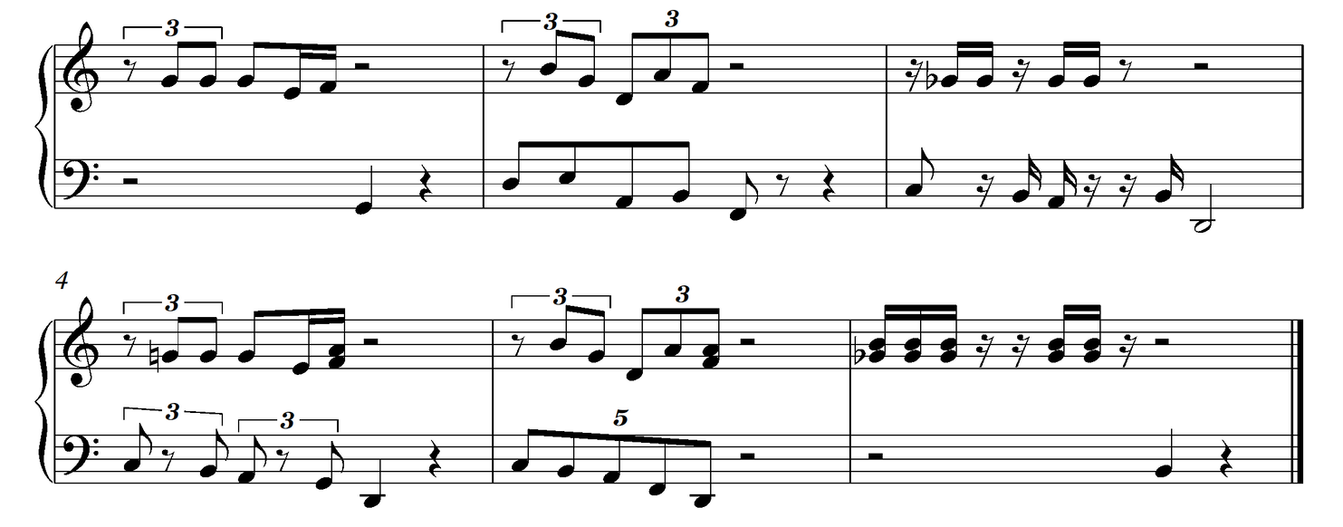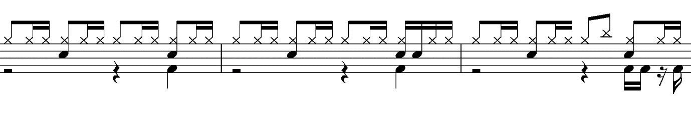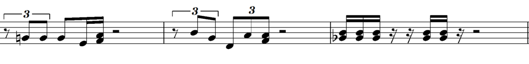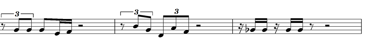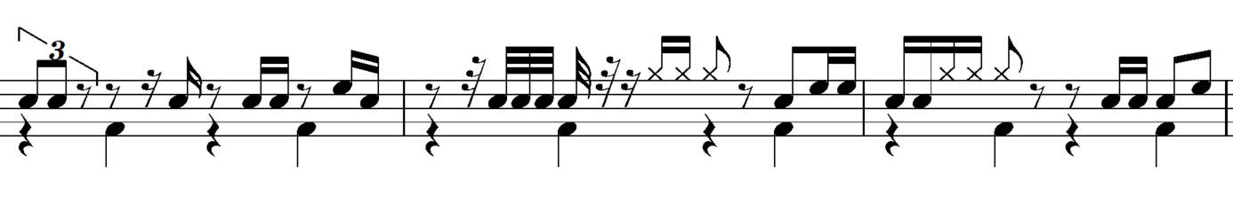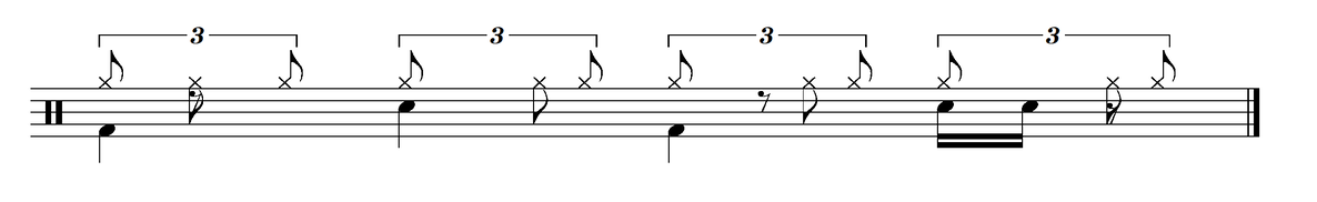 Rhythmic palimpsest is clear, as Dave connects aspects of beats from various contexts, time signatures and feels together. Dave’s groove often contains pulses based on multiple feels simultaneously (in the final example: crotchet, duple, triplet quaver and semiquaver), seemingly affecting stream segregation.Even Dave’s backbeat – the most dependable of temporal markers – fluctuates between pulses and placement within the beat. Drawing on Dilla’s work, the beats Dave plays appear microrhythmically derived rather than metrical.