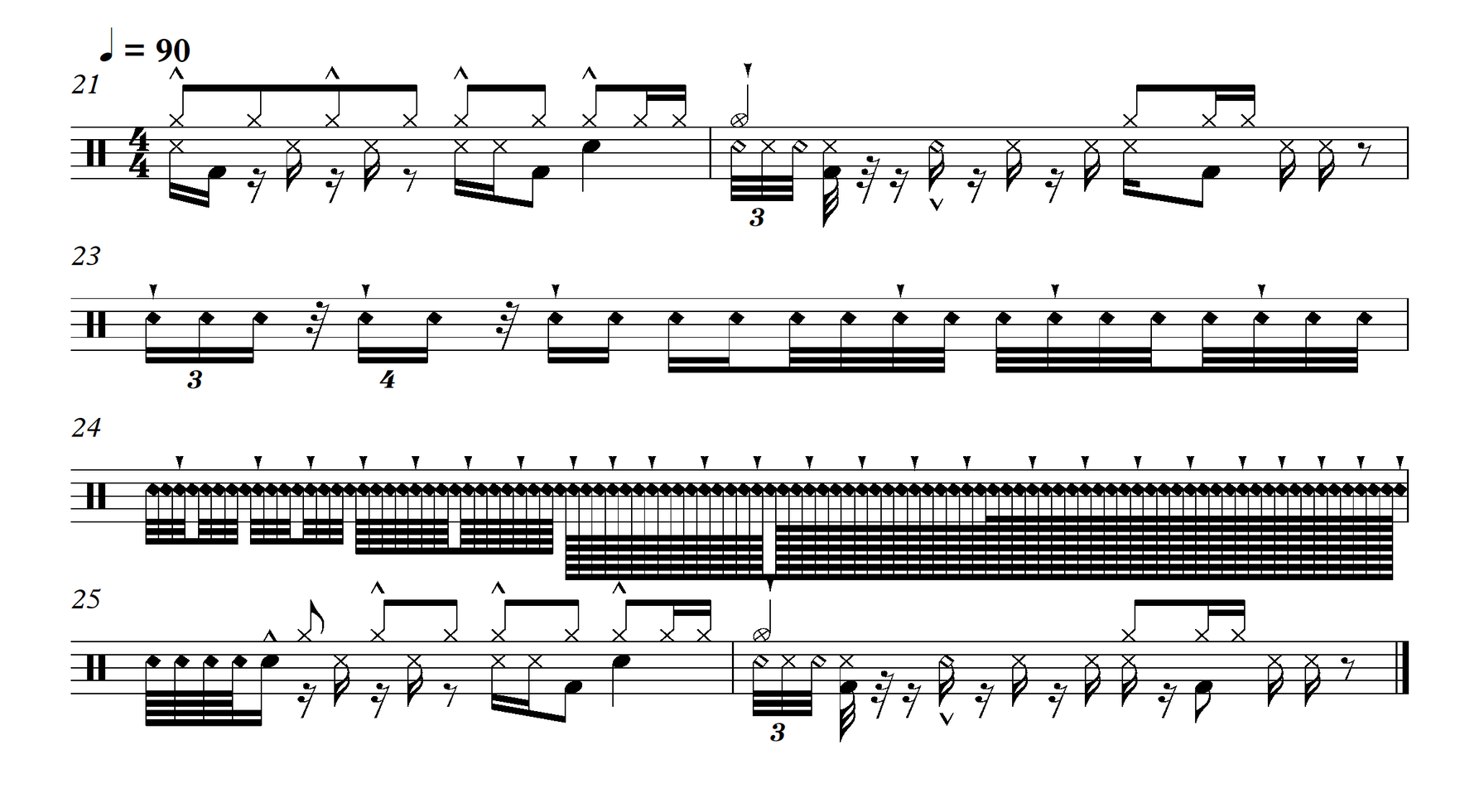 Crucially, Dave does not perceive his playing style to be polyrhythmic. Polyrhythms are always necessarily apophatically defined (defined against what they are not, being the central pulse) and to be polyrhythmic, Dave would have to be playing against a main ‘correct’ pulse. In reality, however, he and The Drumhedz feel multiple pulses simultaneously. Does Dave play in 4/4 with 12/8 interpolations or vice-versa? Or neither? Or something else entirely? Ultimately, the question is irrelevant, since no singular pulse holds authority over the others in order to centralise a definition of Dave’s playing. This allows Dave the freedom to seemingly slip ‘in’ and ‘out’ of ‘time’ freely and play phrases that are analogous to Ornette Coleman’s ‘erasure phrases’. The Drumhedz play polytempic time not as ‘either/or’ but ‘both/and’.