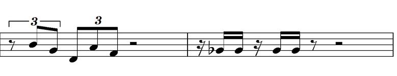 Rhythmic palimpsest is clear, as Dave connects aspects of beats from various contexts, time signatures and feels together. Dave’s groove often contains pulses based on multiple feels simultaneously (in the final example: crotchet, duple, triplet quaver and semiquaver), seemingly affecting stream segregation.Even Dave’s backbeat – the most dependable of temporal markers – fluctuates between pulses and placement within the beat. Drawing on Dilla’s work, the beats Dave plays appear microrhythmically derived rather than metrical.
