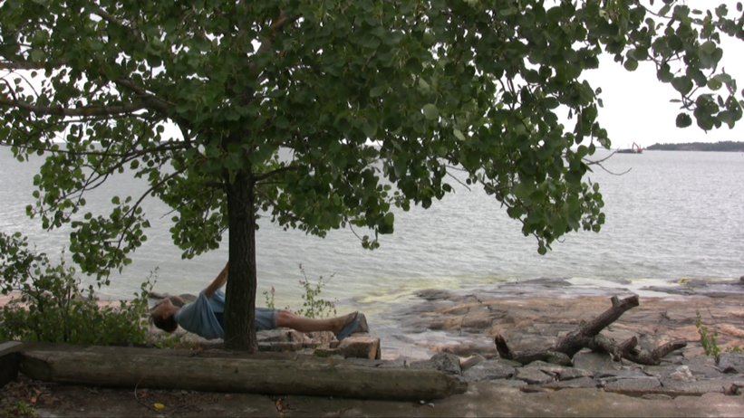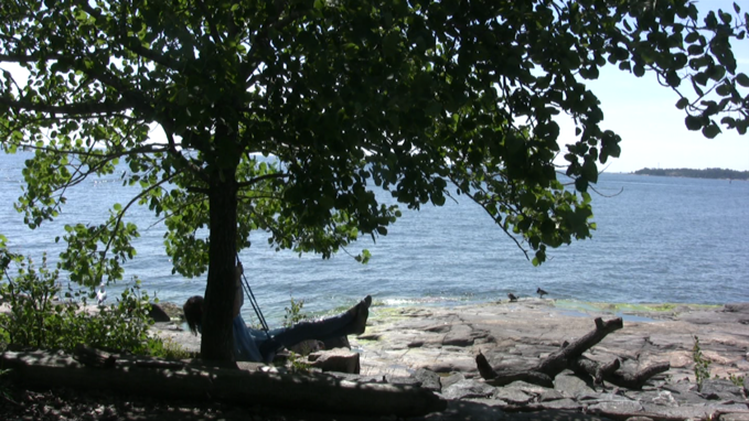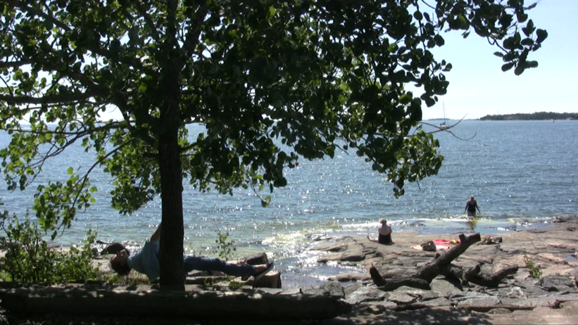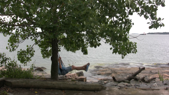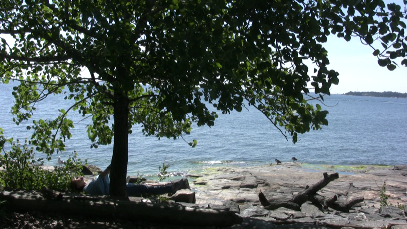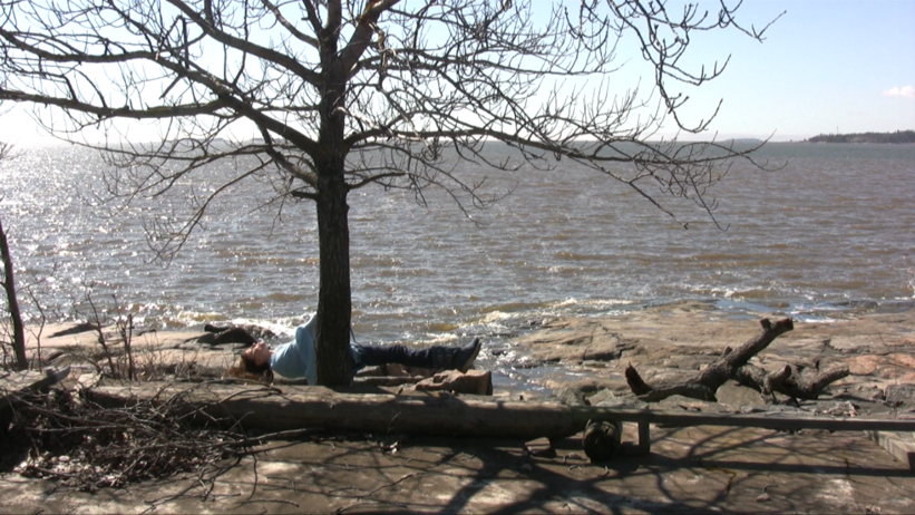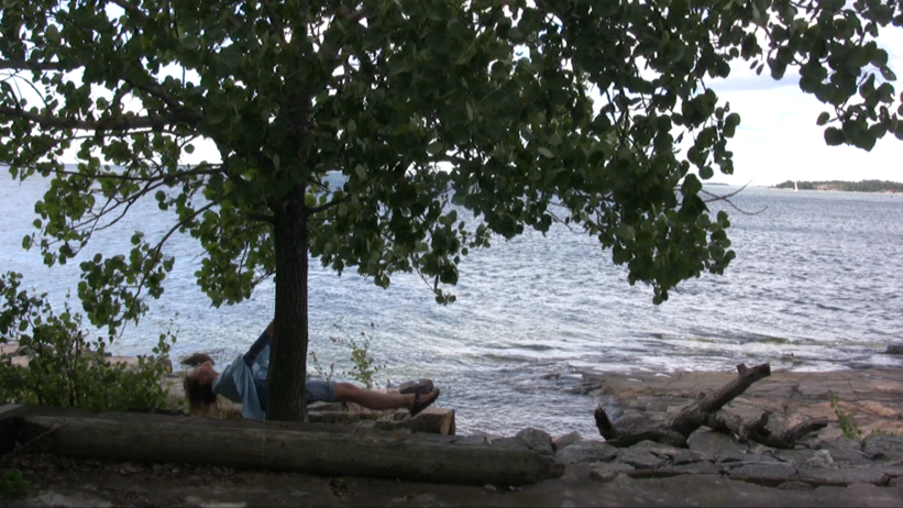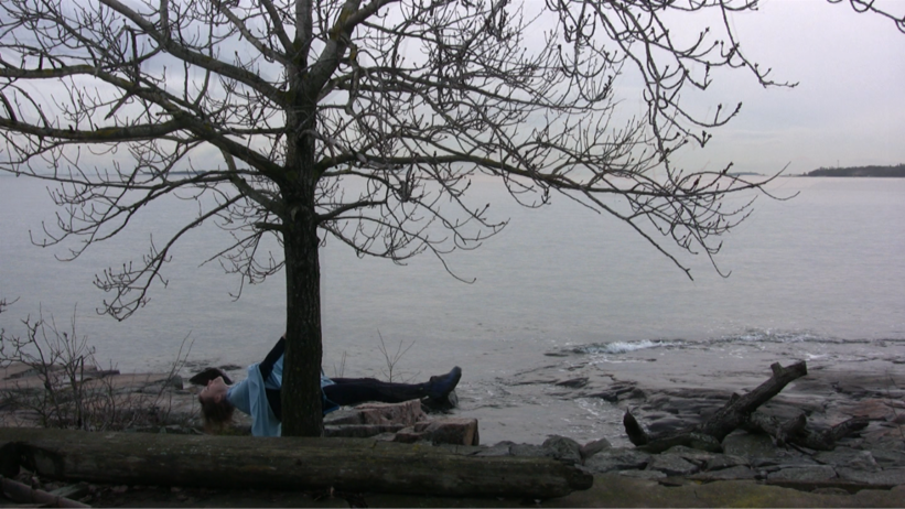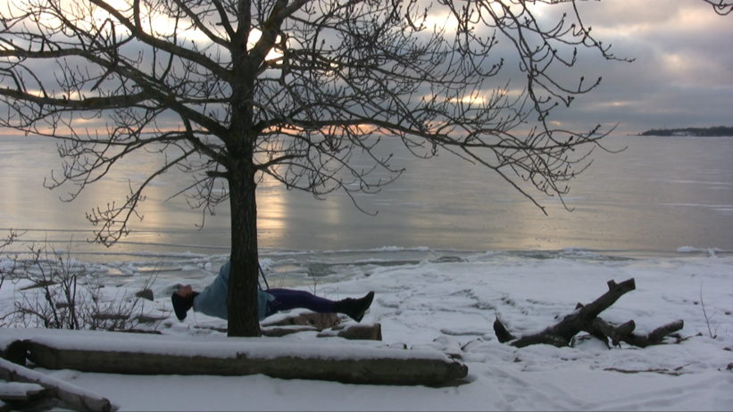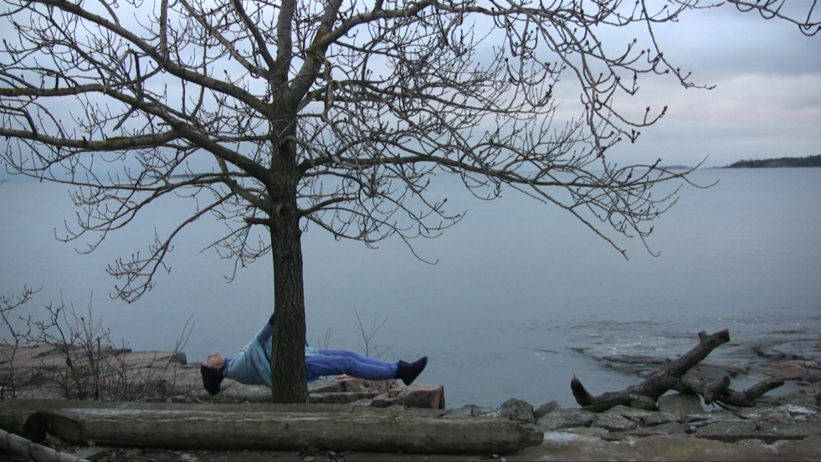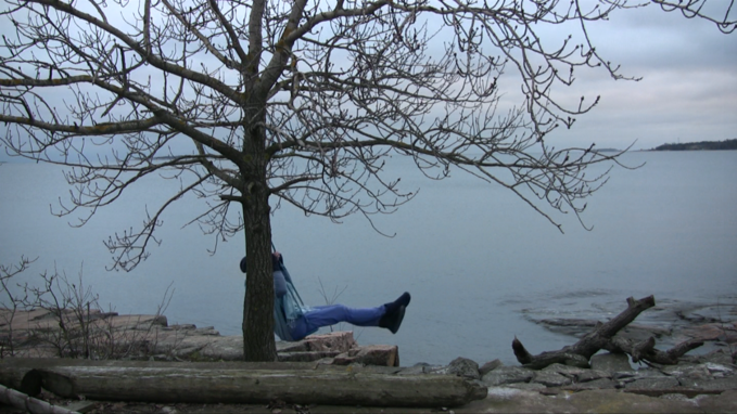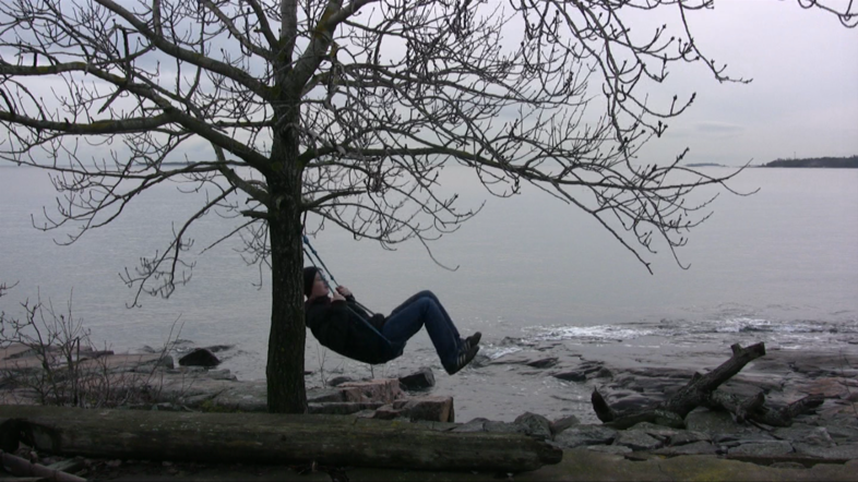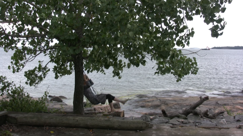 Wrapped in a pale blue scarf I am lying in a swing attached to an aspen on the western shore of Harakka Island approximately once a week during the year of the snake between 10 February 2013 and 28 January 2014.