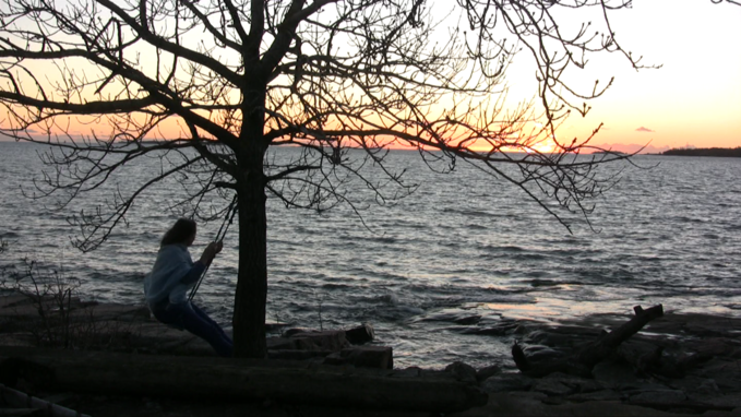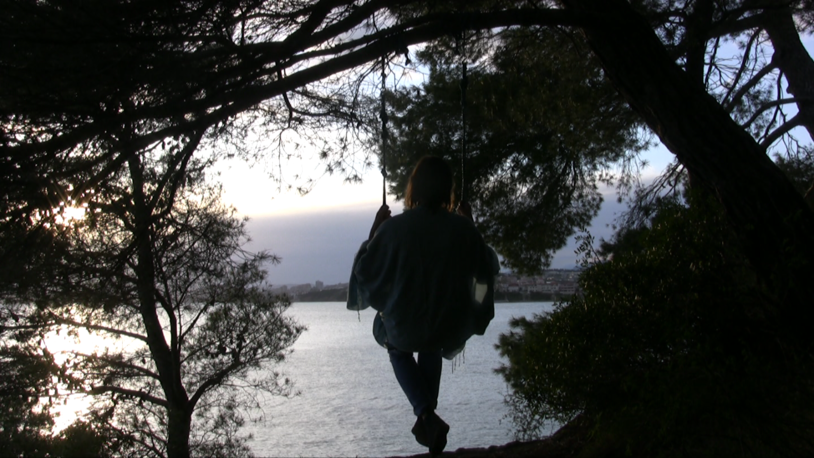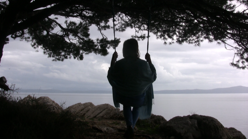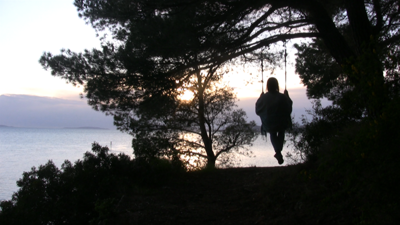 Wrapped in a pale blue scarf I am swinging in a swing attached to trees on the shore in Split one evening in Spring 2013.