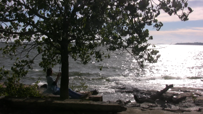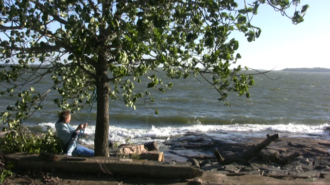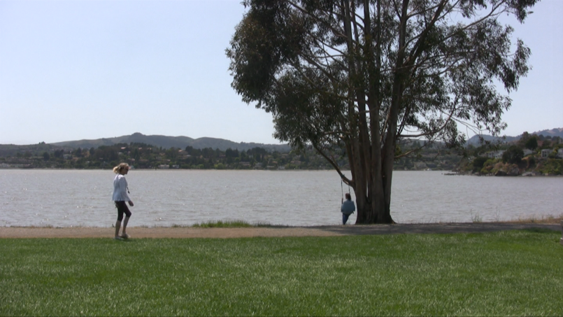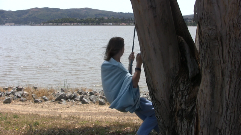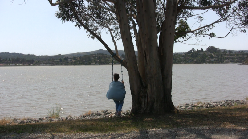 Wrapped in a pale blue scarf I am swinging in a swing attached to a tree on the shore in Tiburon on a summer day in 2013.