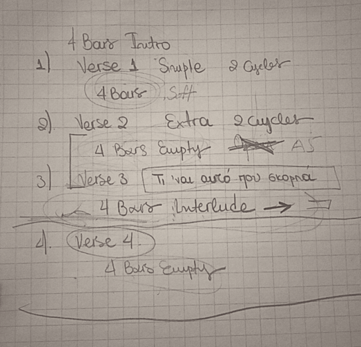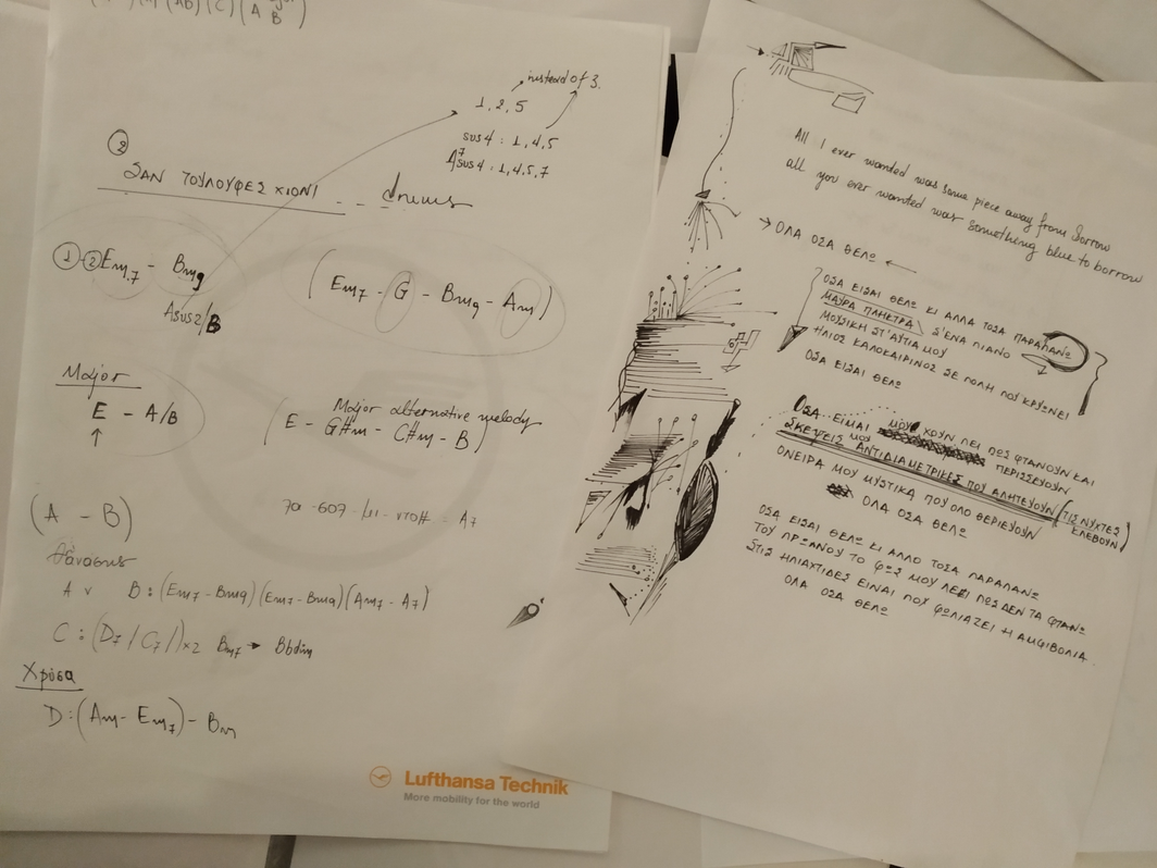 So every song had its own needs and its own way to be approached by the band. Staying in the same example of ‘If I’ll lose you’, the challenge was to find a way to play the song in a live setting with acoustic instruments. A detailed music sheet wouldn’t provide much information for this song. Instead, a picture could transfer the feeling and expression. We worked with customized notation in every song for every player, and I like to believe that this saved us time. There were songs though, like the ‘Bolero’, that traditional western notation was the right tool for rehearsing. There were also others, like ‘I am not the woman you fancy’ for which we didn’t use any form of notation.