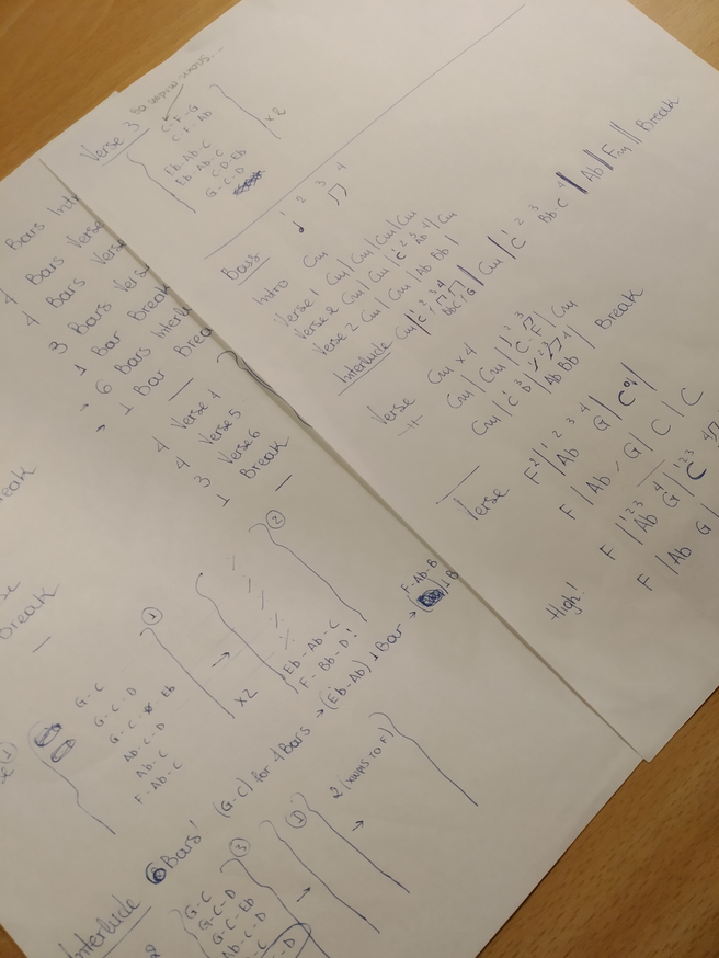 There was an opportunity for a small performance and I brought the song to two good friends of mine with whom I have worked on several projects in the global music programme, an accordionist and a percussionist. I used the demo to firstly introduce the song. Our meetings took place in a rehearsal room, every time for a couple of hours and our agenda was to prepare the set list. Since this song has a relatively easy structure, I remember we spent most of the time focusing on the accompaniment. The rythm is in 6/8, but when we played together it turned into a more waltz like feeling, or a more even-accented feeling than the flowing vibe I was hoping for.