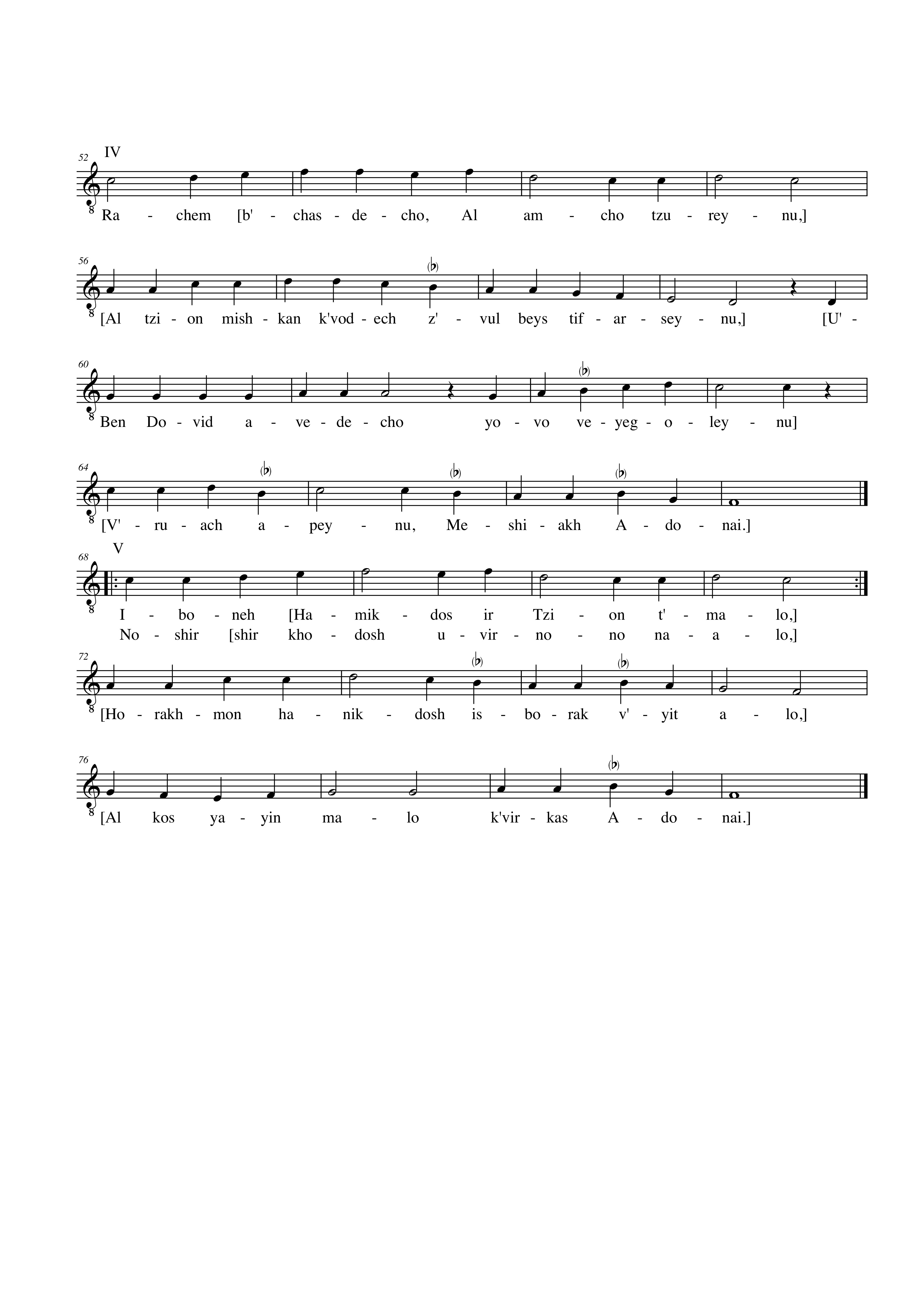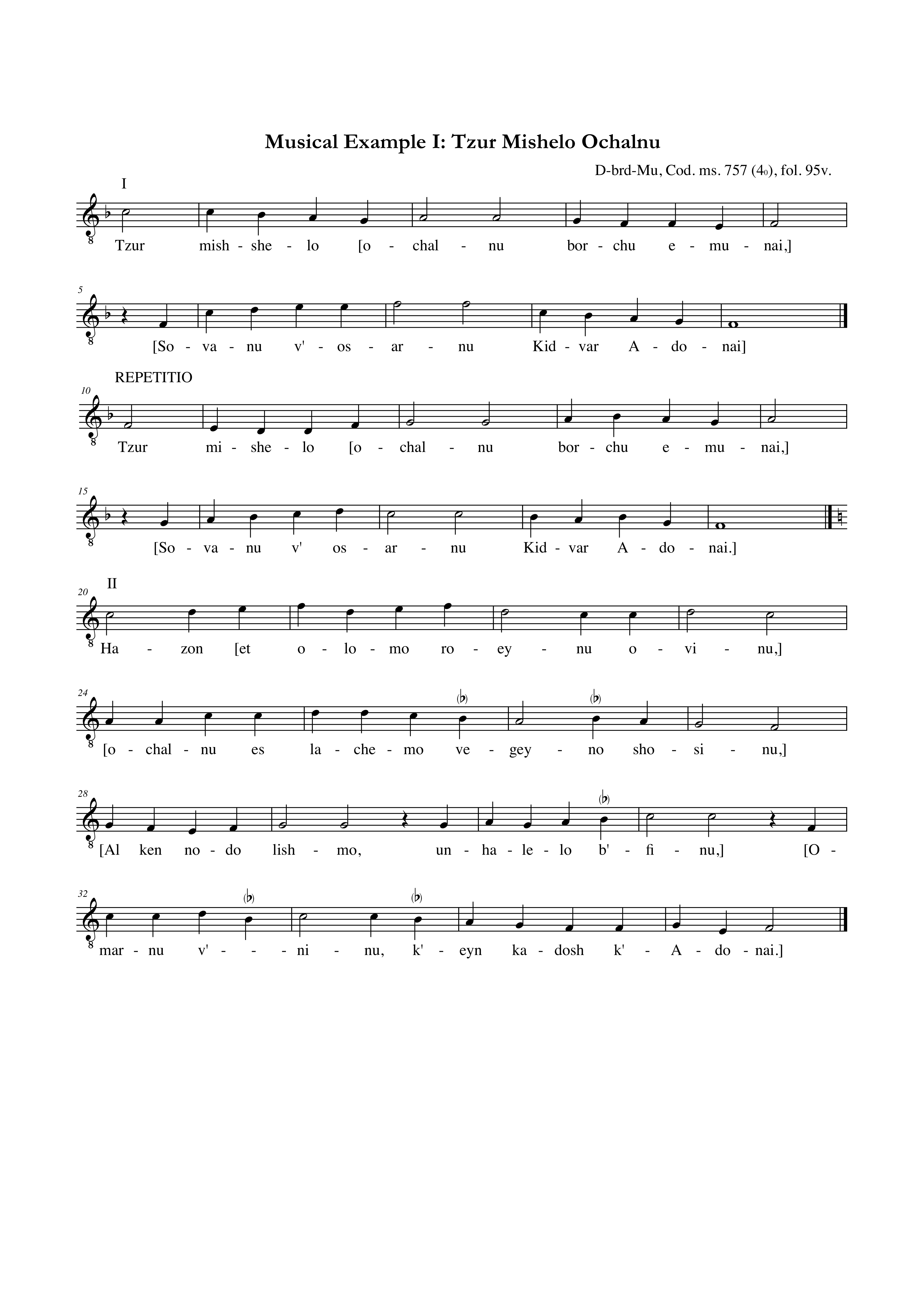 A German Tzur Mishelo with music that could be a plausible melodic model was discovered by the musicologist Israel Adler in the Bavarian National Library in 1984,[54] München, 4° Cod. ms. 757, a Hebrew exercise book compiled and copied by Johannes Renhart, finished at some time between 1510 and 1511 in Esslingen.[55] Its structure is made up of a ritornello, where the first four lines (eight hemistiches) of text are repeated twice to different tunes, followed by five stanze, each with its own music. This ‘through composition’ is unusual if not unique, because the normal practice at the time was to set only one strophe to music, and to write the rest of the strophes down in text-only form, presumably under the assumption that a singer would set the rest of the text independently. In the Munich manuscript (see Musical Example I – bars and bar numbers have been added to facilitate reference) each strophe has its own melody, and all are interrelated, with small but significant differences related to text and function. In my opinion, this and other considerations point towards its being an early example of ethnomusicological fieldwork, that, furthermore, might call for a reconsideration as to how strophic song was actually performed.[56] The added or subtracted notes according to accent and syllabic count (compare bars 28, 44 and 59-60), changing contour and final tone in the second line in the internal strophes (m. 24-27: f, 40-43: g, 56-58: d, 72-75: f - see musical example) and the distinctive structure (using pre-existent melodic elements) of the final strophe, which probably heralded the arrival of the last repetition of the ritornello; are all consistent with the kind of changes made during actual performance, as opposed to a transcription made according to the usual constraints of written transmission.[57] In fact, the same kind of melodic transformations can be observed in performances of the piyyut, which has remained in the Jewish tradition, from across the globe.[58]