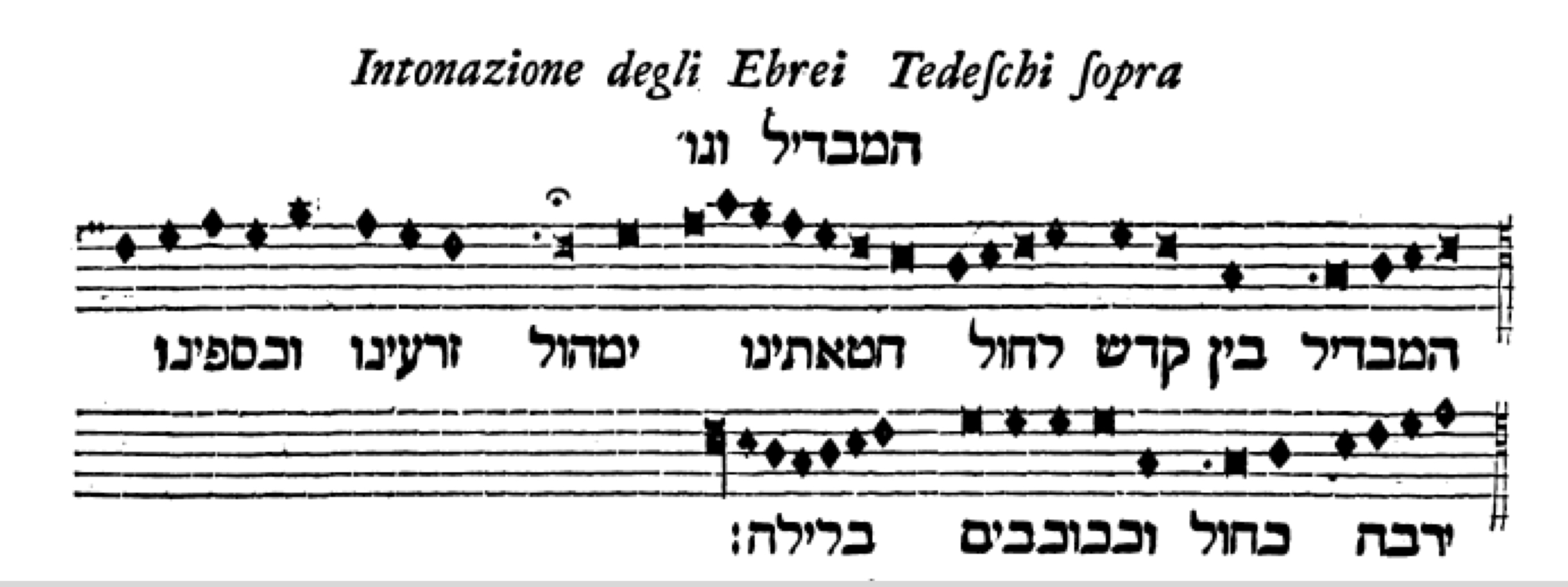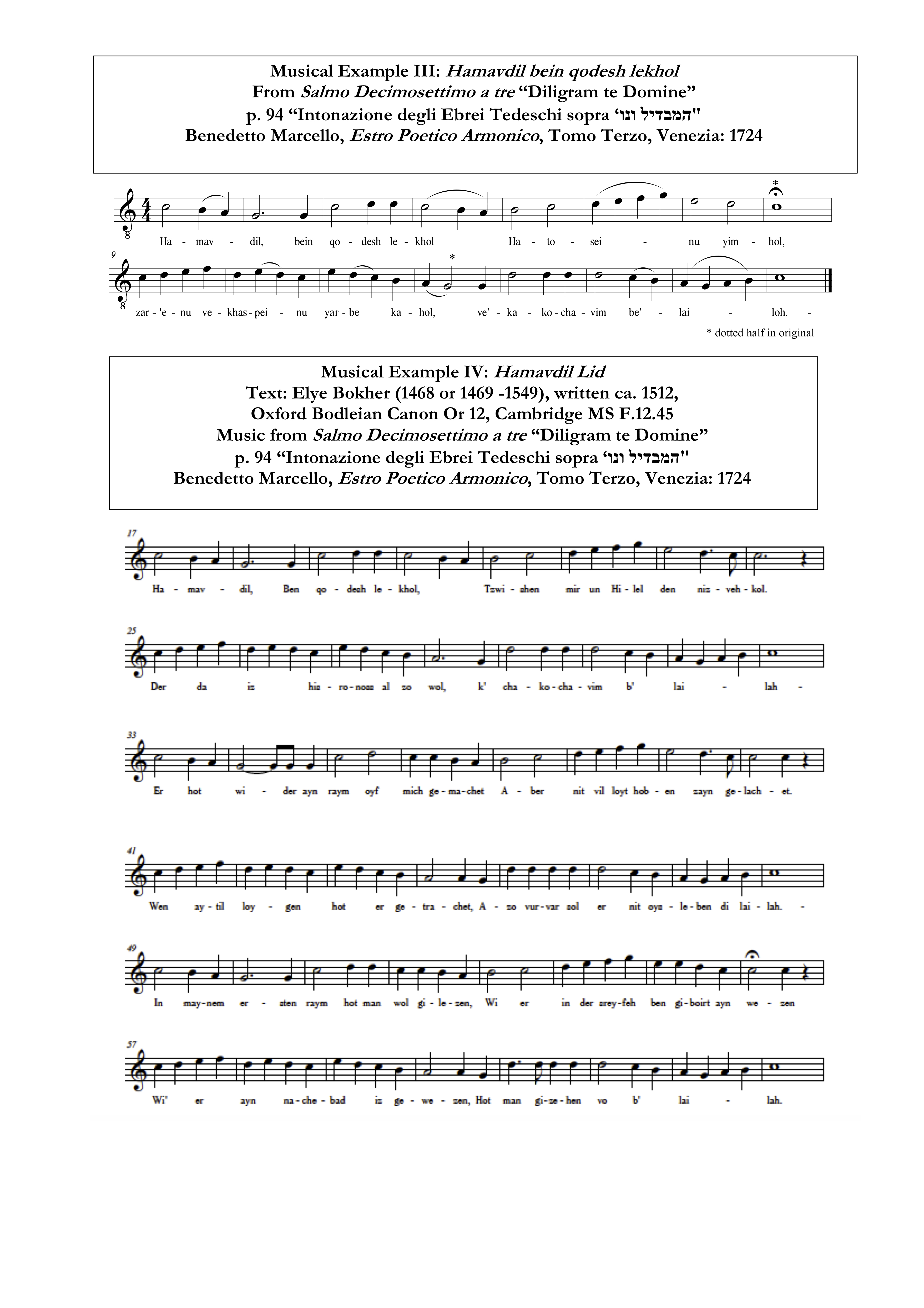 Marcello, Benedetto. Estro Poetico Armonico, Tomo Terzo, Venezia: 1724, p. 94. Called ‘Intonazione degli Ebrei Tedeschi sopra המבדיל ונו’, it is the model for the melody of Salmo Decimosettimo a tre "Diligram te Domini" , p. 94. ↩︎