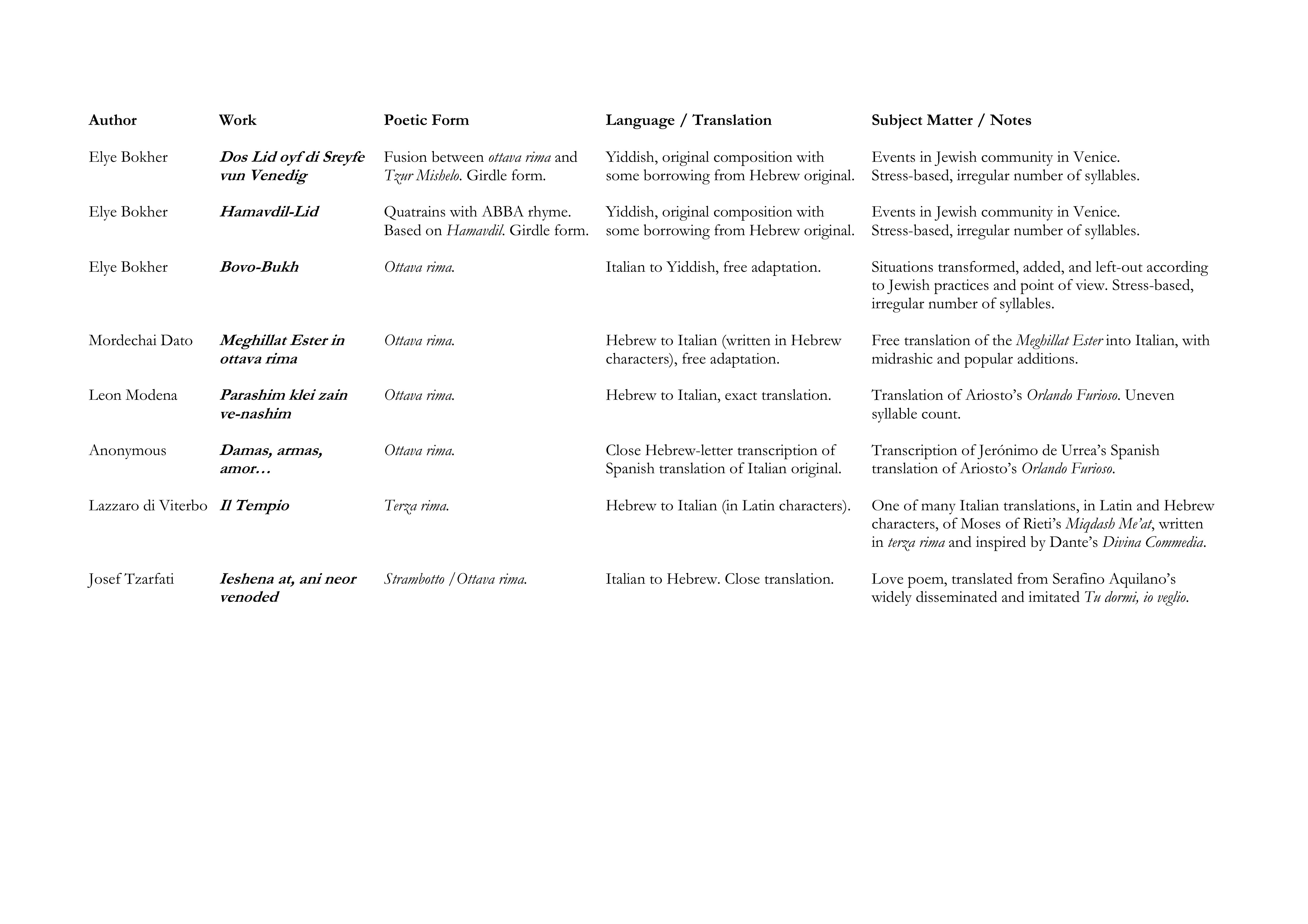 f) The poem’s meter is that of a form that was normally sung, such as the ottava rima (the* Bovo Bukh*, the Meghillat Ester in ottava rima) terza rima (Me’on Ha’shoalim, Il Tempio) sonnets (in some cases) or the so-called Shmuel bukh and Bovo bukh tunes.