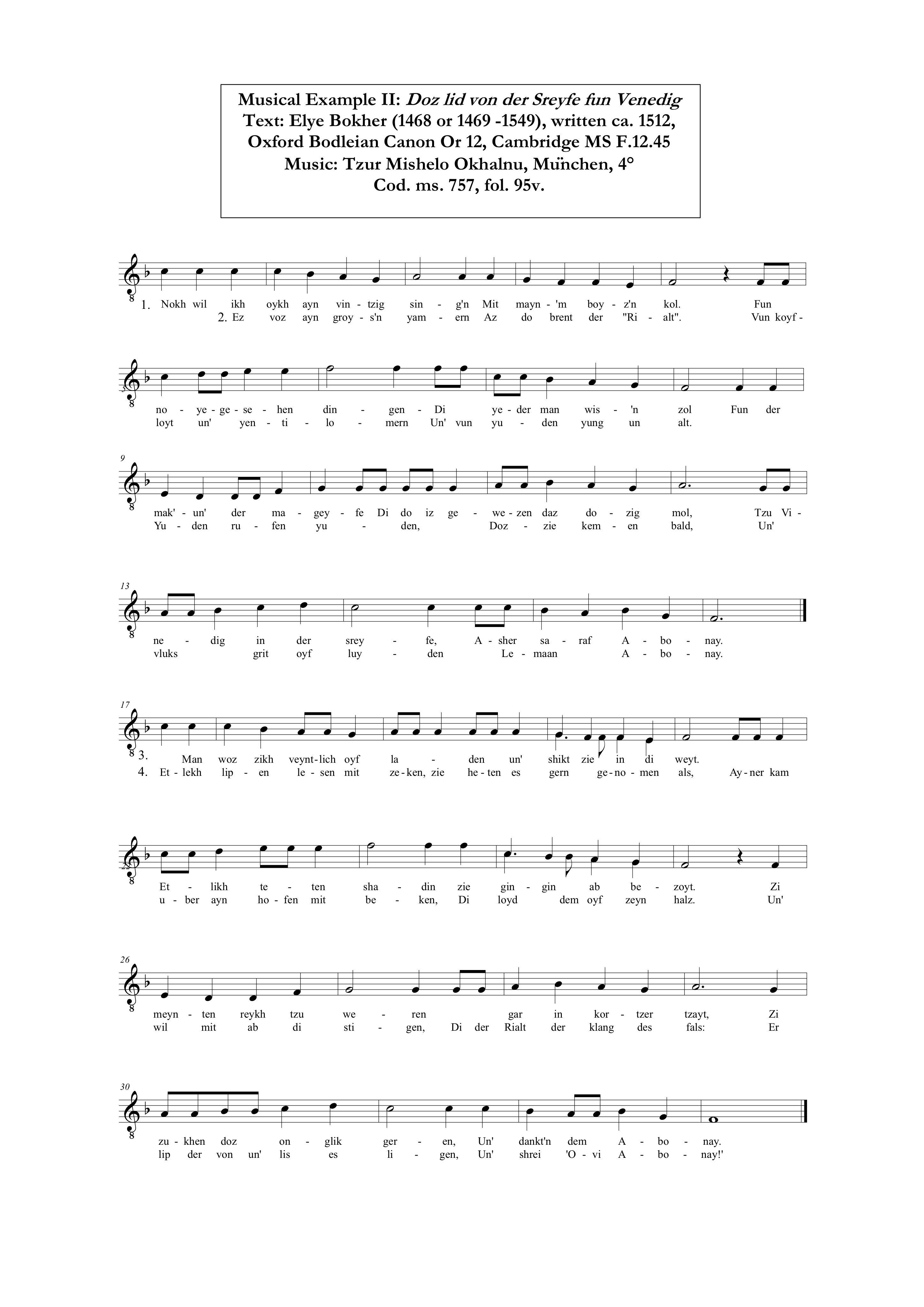 As far as melodic models are concerned, we are not as fortunate as in the case of the Sreyfe Lid, where a geographically and temporally appropriate model has survived. Here, although the tune transcribed is indicated as one sung at the German Synagogue in Venice, the model dates from 1724, more than 150 years after Elye Bokher’s death and the compilation of the poem’s surviving sources.