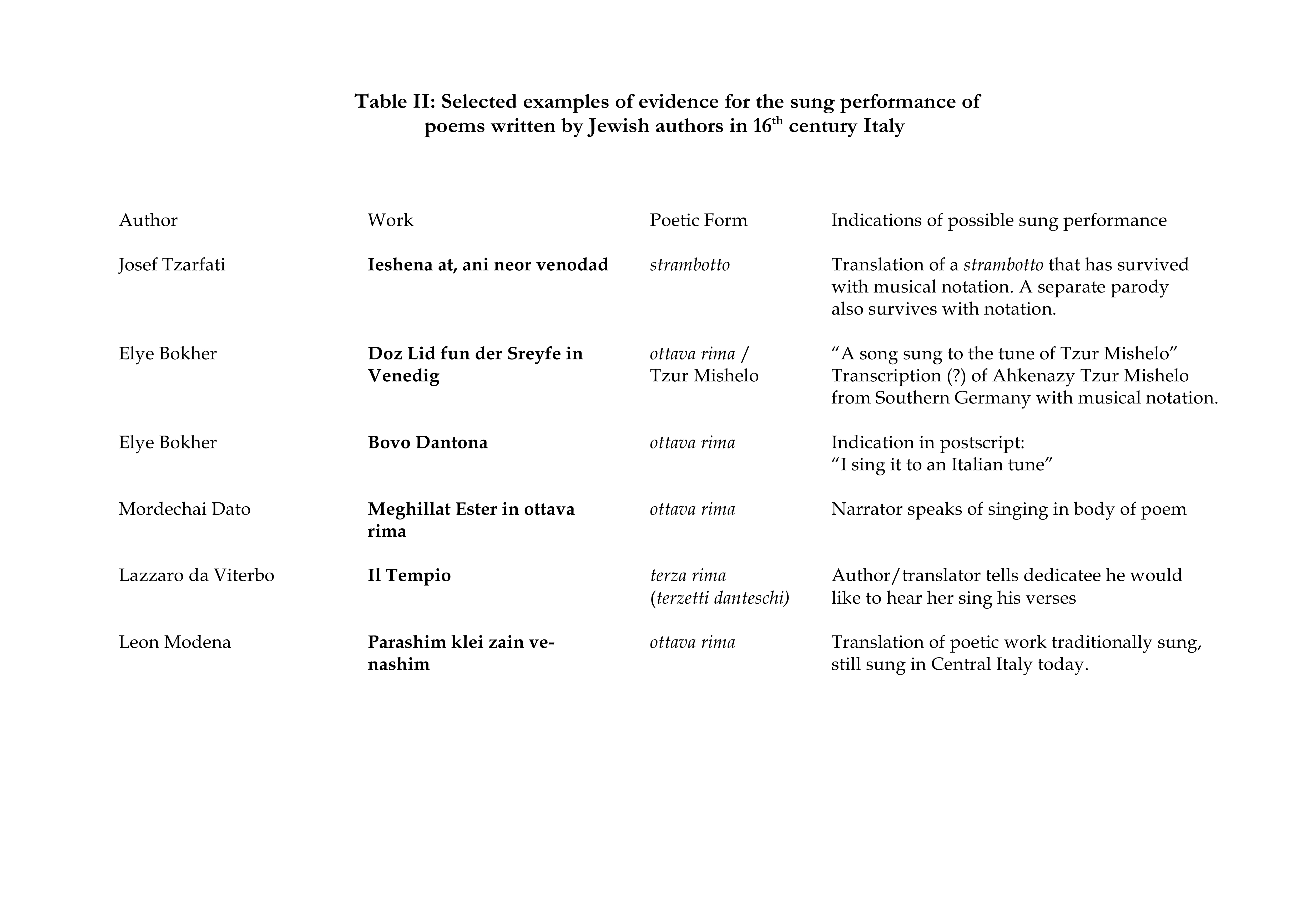 I have included two tables here that give examples of the ‘crossover’ that went on in the Italian Jewish community during the 16th century (Table I) as well as examples of evidence of sung performance (Table II).
