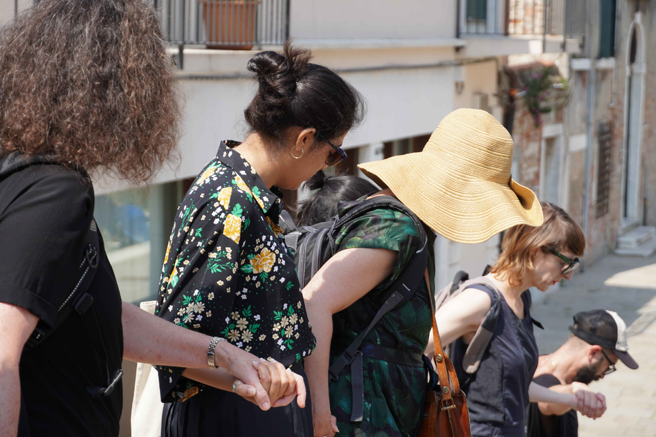 Drawing on their contribution to the No Telos! publication, Andrew Brown and Katja Hock guided participants on a blind walk through Guidecca, designed to overturn the predominantly visual experience of Venice, providing an opportunity to individually explore through body language the apparently contradictory states of togetherness and solitude, being guided and feeling lost. The exercise offered participants a liminoid space in which the real-world consequences of being lost are side-stepped.