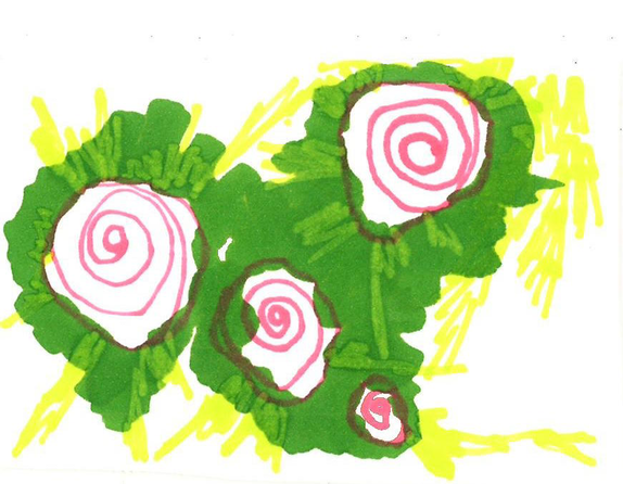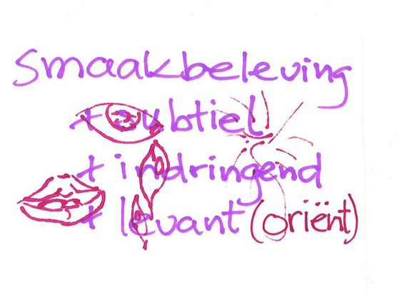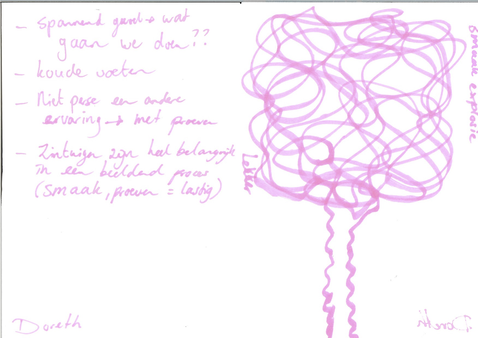 Daarnaast, ontdekte ik tijdens het eerste experiment, dat de deelnemers instaat waren om van hun zintuiglijke waarneming van smaak, prachtige ‘vertalingen’ te maken. Dit idee van smaak als startpunt voor een beeldende vertaling of proces wilde ik hierna verder onderzoeken. Naar aanleiding hiervan ging ik ook zelf beeldend aan de slag, ik ben tekeningen gaan maken van mijn smaakervaringen. Door het gehele onderzoek heen ben ik dit blijven doen. Omdat iedere smaakervaring een nieuw resultaat opleverde.
