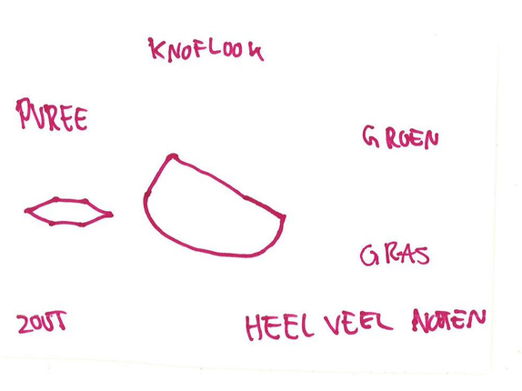 Dit had als gevolg dat ik grip probeerde te krijgen op de manier waarop ik zelf ‘smaak’ ervaar. Kleine (smaak)experimentjes; zoals proeven met mijn neus dicht, en het uitproberen van eten met een ‘onaantrekkelijke’ vorm, werden op een speelse manier betrokken bij het onderzoek. Mijn eigen, belichaamde ervaring van smaak werd onderdeel van mijn praktijk. Door het vergroten van mijn eigen begrip, lukte het in de fase die volgde om beter uit te sluiten waar ik wel, en niet naar opzoek was.