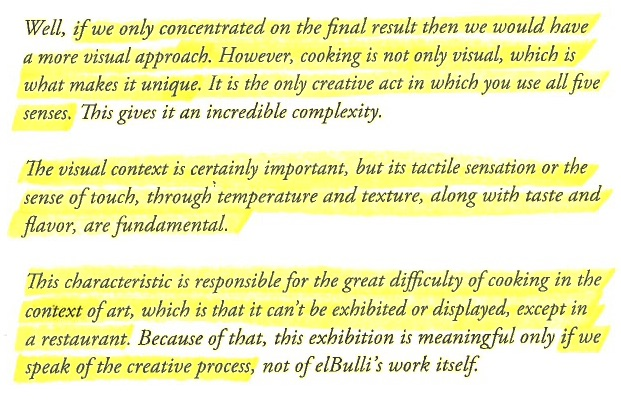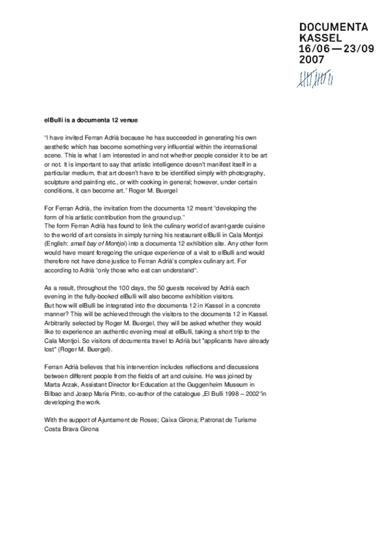 Met zijn deelname aan de Documenta 12 laat Ferran Adrià zien dat zijn elBulli ervaring niet bestaat zonder de context van zijn restaurant, tegelijkertijd zet hij aan tot een debat over artistieke disciplines die niet getoond kunnen worden binnen een museale context. (elBulli, 2007)
