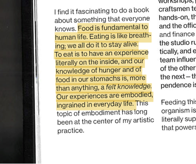 Dit is waarom ik in fase 3 opzoek ging naar de verbindingen met mijn context. Om mijn eigen werk te begrijpen binnen de context van de beeldende kunsten, raadpleegde ik de literatuur van Maurice Merleau-Ponty, (Braembussche, 1994) zodat ik mijn denken kon kaderen. Zijn denken over het lichaam-subject, sluit aan bij de manier waarop Olafur Eliasson de handeling van het eten benaderd als belichaamde ervaring. Ponty zegt ‘Je hebt een lichaam en je bent een lichaam.’ Door artistiek onderzoek te doen naar deze belichaamde ervaring, zoals Eliasson doet. Kunnen we door dringen tot wat hij ‘felt knowledge’ noemt. (Eliasson, 2016) Dit is ook waarbinnen ik de opbrengsten van mijn eigen onderzoek plaats. Het onderzoek genereert niet zozeer nieuwe kennis, maar eerder ‘felt knowledge’ die we alleen tot ons kunnen nemen met de belichaamde ‘ervaring’.
