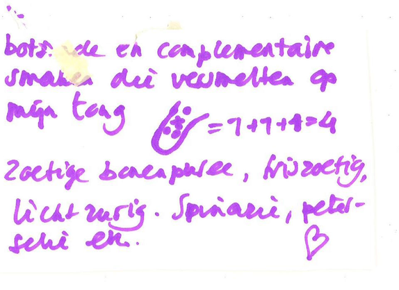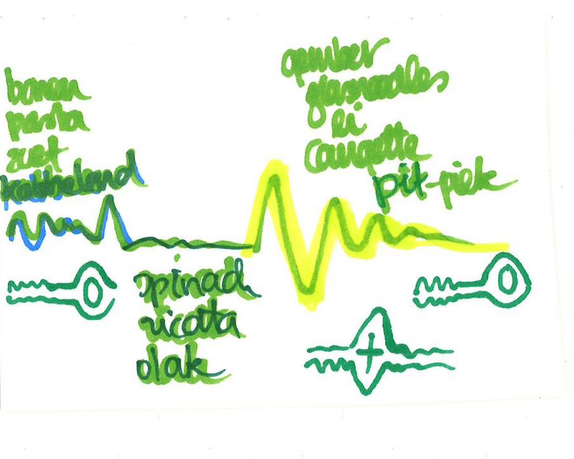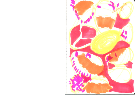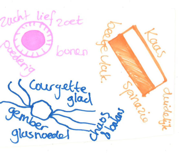 Daarnaast, ontdekte ik tijdens het eerste experiment, dat de deelnemers instaat waren om van hun zintuiglijke waarneming van smaak, prachtige ‘vertalingen’ te maken. Dit idee van smaak als startpunt voor een beeldende vertaling of proces wilde ik hierna verder onderzoeken. Naar aanleiding hiervan ging ik ook zelf beeldend aan de slag, ik ben tekeningen gaan maken van mijn smaakervaringen. Door het gehele onderzoek heen ben ik dit blijven doen. Omdat iedere smaakervaring een nieuw resultaat opleverde.