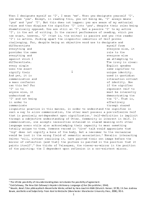 Clear from dictated paths, Self reclaims movement as a means of interrogating and defying entire linguistic, ontological and interpellatory edifications and structures of being and thinking, representations of social organisation.[6] Within the expression of Self is the surexpression of Self.