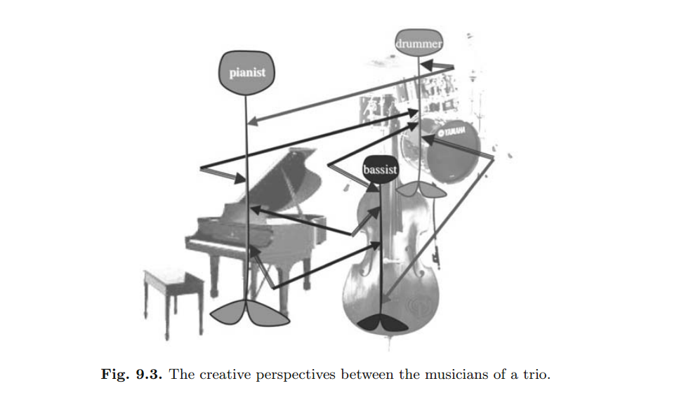 Let us now apply the theorem in the concrete musical situation of a trio, composed of a pianist, a bassist, and a drummer. The three musicians are involved in hypergestural perspectives in the following ways. [Hypergestural iterations are previously defined: ‘This hot spot is based upon the n! permutations of skeletal digraph sequences that generate the hypergesture space Γπ(1) −→@Γπ(2) −→@ ...Γπ(n) −→@X.’] In a specific hypergestural space, each musician momentarily chooses a permutation π of his/her directed graphs (relating to his/her topological space). In figure 9.3, this is graphically represented by a named symbolic figure (pianist, bassist, drummer), where a short thick arrow points to a determined height of that figure, which symbolizes the permutation pi. This choice is also a function of the musical partner, to which the attention is directed. Therefore every musician is provided with two such short thick arrows. Next, each self-perspective is taken as a starting position to point to one of the partners. This partner then is also viewed under a specific permutation of the partner’s sequence of hypergestural directed graphs.[2]
