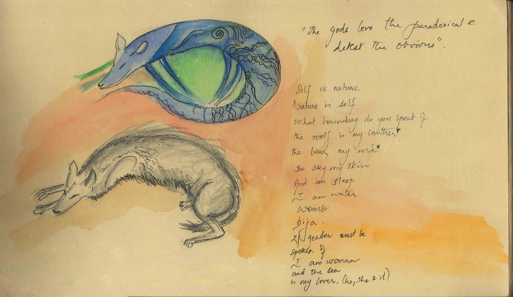 The Indian Wolf is an enigmatic creature. I was sketching it to capture its forms, when my own sense of oneness with the being flowed through, allowing me to expand my wolf sketches to sketches of interiority framed by wolf boundaries. Indian farmers in North Karnataka think of the wolf as their brother. Bija, the sanskrit word for seed, is seen as a metaphor for the origin of things. Working on a sketch like this one opens up doorways to interiority. The sketch happens without thought and when I begin to annotate and observe the outcome closely, it becomes possible to see the non-linear connections that have emerged to create new meaning. These connections draw from ancient memories of self, connection with the natural world, cultural perspectives and symbolism. In studying several such sketches over a period of time, I am able to unravel the methods, principles of engagement that can provide an unhindered space for the creative state and consciousness of being porous.