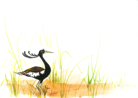 A quick sketch study of the lesser florican, an endangered species, to capture its attitude and sense of ownership of landscape.