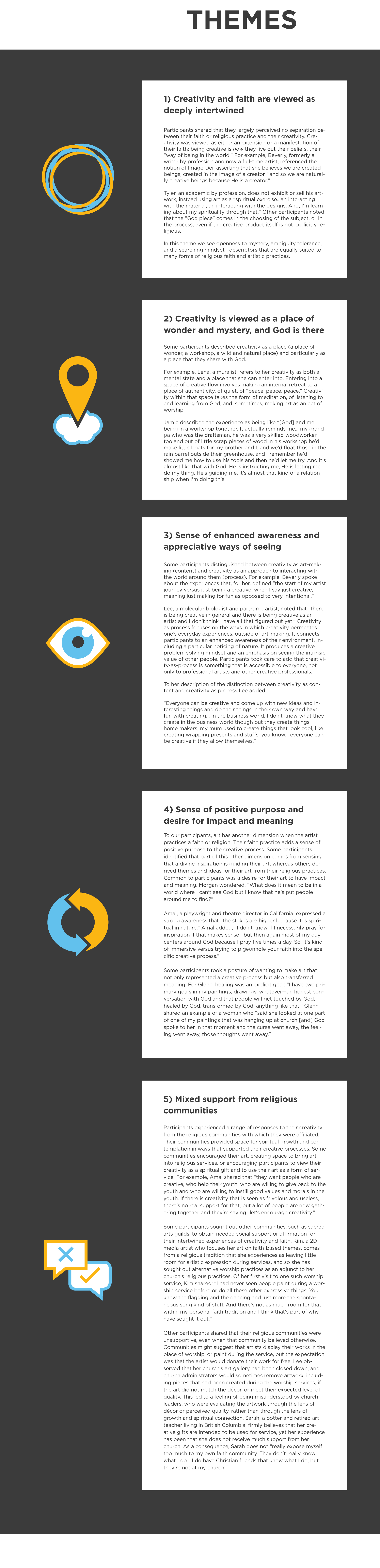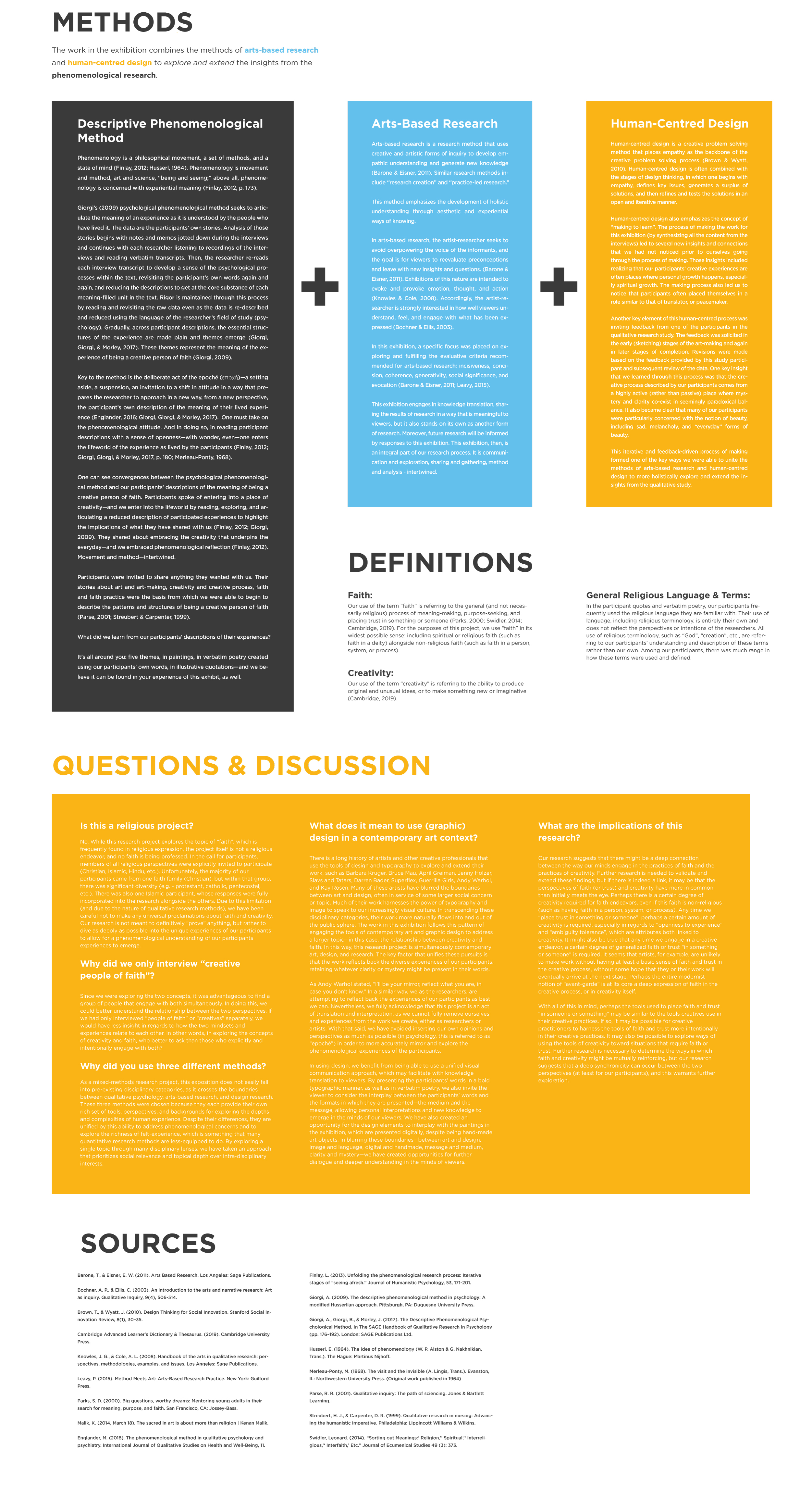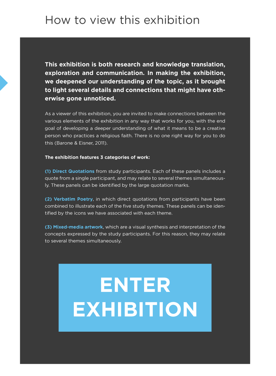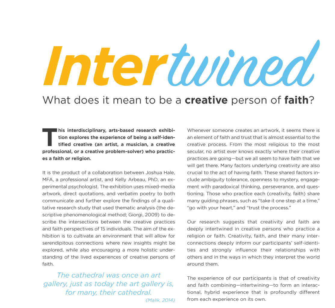 From the most religious to the most secular, no artist ever knows exactly where their creative process is leading—but we all seem to have faith that we will get there. Many factors underlying creativity are also crucial to the act of having faith. These shared factors include ambiguity tolerance, openness to mystery, engaging with paradoxical thinking, perseverance, and questioning. Additionally, those who practice each (creativity, faith) share many guiding phrases, such as “take it one step at a time,” “go with your heart,” and “trust the process.” This interdisciplinary arts-based research project explores the experience of being a self-identified creative who practices a faith or religion. The exhibition combines methods from arts-based research, human centered design, and phenomenology to describe the intersections between the creative practices and faith perspectives of 15 individuals. The experience of our participants is that of creativity and faith combining—intertwining—to form an interactional, hybrid experience that is profoundly different from each experience on its own.