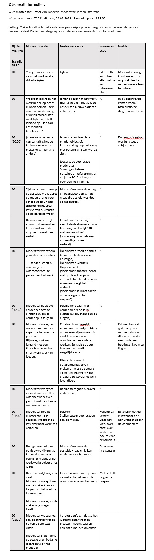 Aan de methode van Jeroen Offerman kwam weinig structuur te pas. In mijn observatie en deelname ondervond ik vier terugkomende stappen. Ik hield de observatie dan ook als mijn guideline voor deze sessie. Zo hield ik een sessie met de kunstenaar Paul Nieboer (nieboer, 2019). De setting is als volgt: Er is een moderator (die ik zelf ben), de kunstenaar met een werk die hij aandraagt, en een groep die het gesprek aangaat en feedback geeft op het werk van de kunstenaar. In het begin doet de kunstenaar nog niet mee in het gesprek. Wel is hij aanwezig en noteert hij dingen die hij hoort.