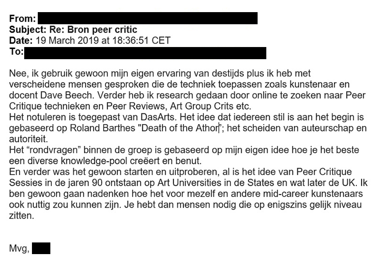 In een tweede mini peer critic sessie die ik organiseerde, gingen we kijken naar het werk van Marlijn van Zadelhoff (Zadelhoff, 2019). Hierin volgde ik een gestructureerde format gebaseerd op de Das Arts-Methode (Bron: voorbereiding mini peer critic 2). In tegenstelling tot de originele methode gaf ik de kunstenaar een aantal keer de mogelijkheid om de vorm van het gesprek te kiezen. Dit gebeurt doordat de kunstenaar de keuze moet krijgen in wat voor hem nodig is of meeste bruikbare, zoals in de Das Arts-methode beschreven staat. Vaak gaat dit samen met de status van het werk. Werk dat af is heeft een andere aanpak nodig dan werk dat in proces is.