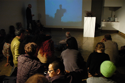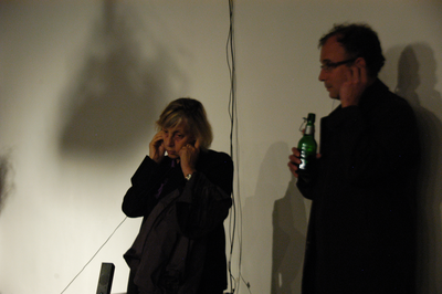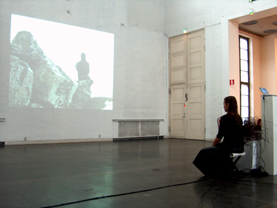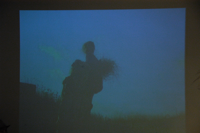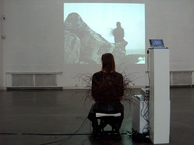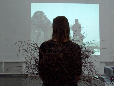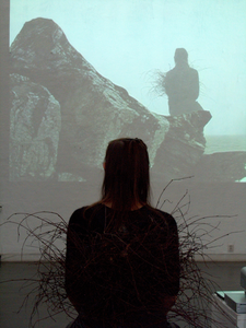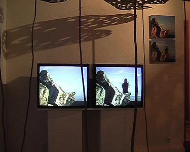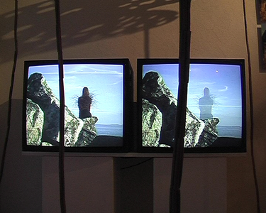 Das Hexenbesen, (video installation, 2 x 14 min. 53 sec. loop) at the exhibition Unter Wasser und Wind, in Atelier Antje Wiewinner, Osnabrück 21.10-3.11.2007. The human figure slowly disappears in one image while appearing in the other. The voice changes slowly from Finnish to English and vice versa. / Das Hexenbesen, (video installation, 2 x 14 min. 52 sek. loop) på utställningen Unter Wasser und Wind, Atelier Antje Wiewinner, Osnabrück 21.10-3.11.2007. Människofiguren försvinner långsamt ur den ena bilden och framträder samtidigt långsamt i den andra. Rösten övergår långsamt från finska till engelska och tvärtom..