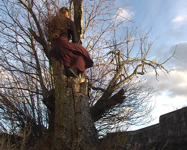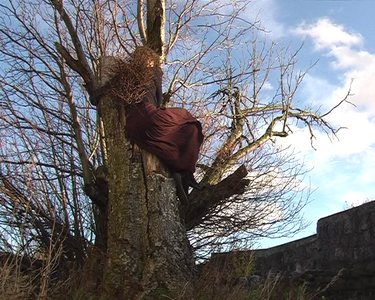 Wind Nest - Witches' Broom (video 19 min. 52 sec.), a performance for camera where the figure climbs up on the stub, sits on it for a while and then climbs down, in real time. / Wind Nest - Witches' Broom (video 19 min. 52 sek.), en performance för kamera, där figuren kliver upp på stubben, sitter på den en stund och tar sig sedan ner, i realtid.