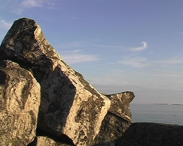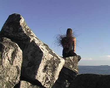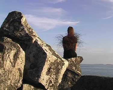 Still from video, a performance for camera with the witches' broom on my back on the western shore of Harakka Island, one evening in August 2006. / Stillbild från video, performance för kamera med markvasten på ryggen på västra stranden på ön Stora Räntan, en kväll i augusti 2006.