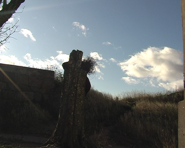 Wind Nest - Witches' Broom (video 19 min. 52 sec.), the edited variation used in the Toronto performance. The figure on the stub slowly disappears from the image and appears again slowly before the end. / Wind Nest - Witches' Broom (video 19 min 52 sek.), den editerade varianten som användes i Toronto-företällningen. Figuren på stubben försvinner långsamt ur bilden och framträder åter långsamt innan slutet.