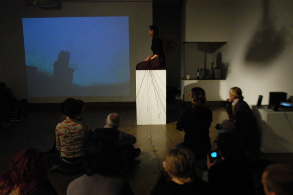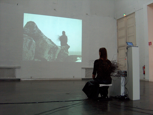 Stillbild från videodokumentation av föreställningen Wind's Nest - Witches' Broom på Amorph! festivalen 15.8.2006 på Fafa -galleriet i Helsingfors.