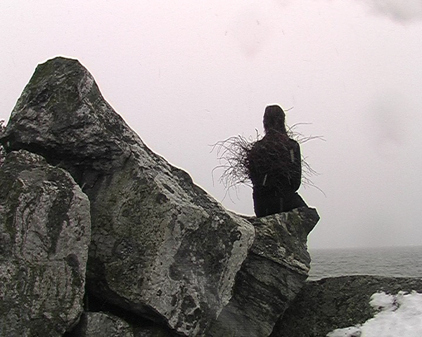 Stillbild från Wind Nest - Witches' Broom (video 19 min. 52 sek.), en performance för kamera sommaren 2008, där figuren kliver upp på stubben, sitter på den en stund och tar sig sedan ner, i realtid.