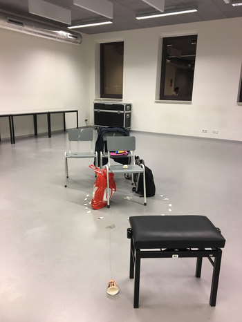 In this experiment, we explore documentation by placing a mark in the place where action had occurred. one person (trigger) explored and interacted with space and another person placed the marks (marker). In the end, space was full of signs that meant different actions. without the "trigger" the "marker" returned and rebuilt the actions that had happened there, the presences the actions and transitions that were generated there. Each footprint is a manifestation of an action at a given time.