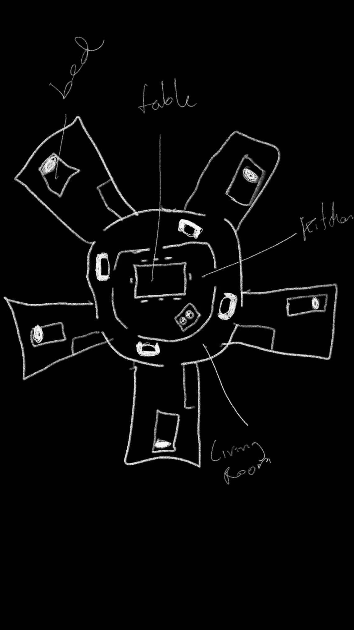 For example, in some drawings here, the kitchen is in the center and the whole house converges around it even when in reality the kitchen is in another geographical point.