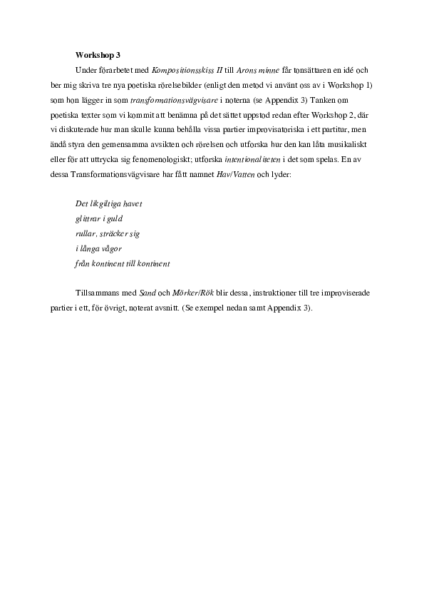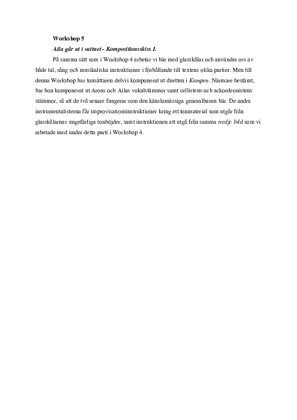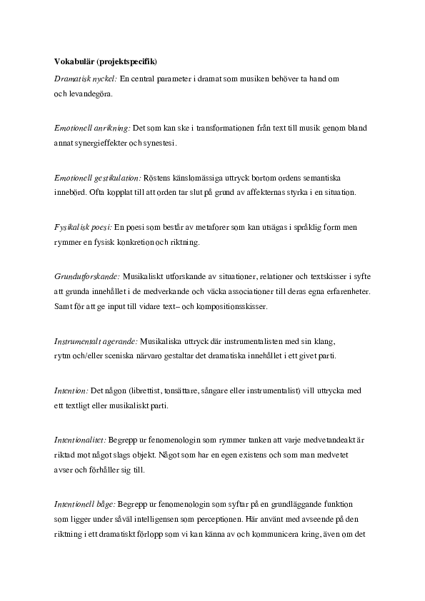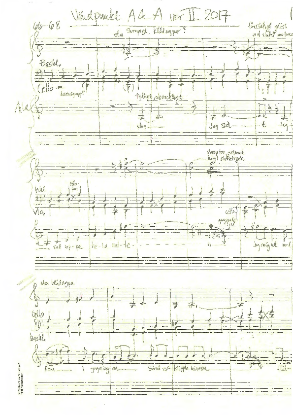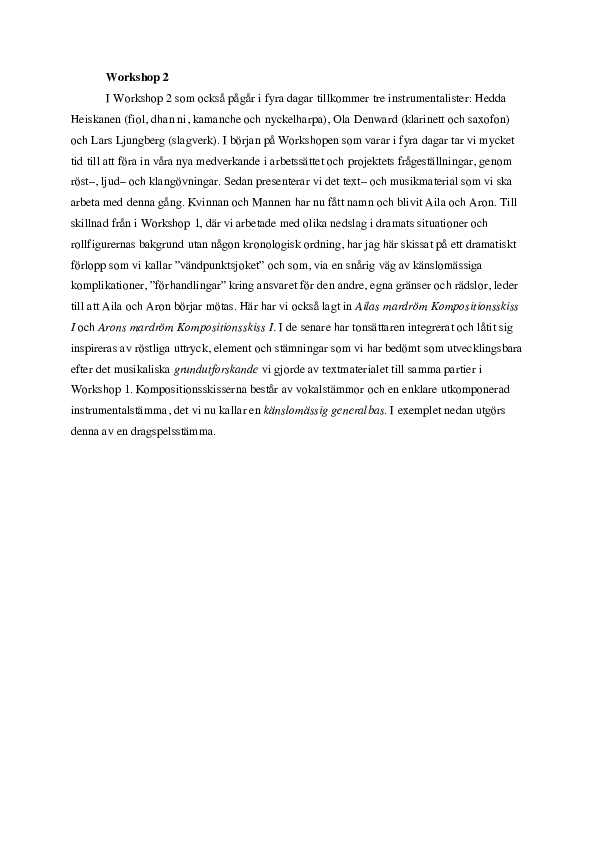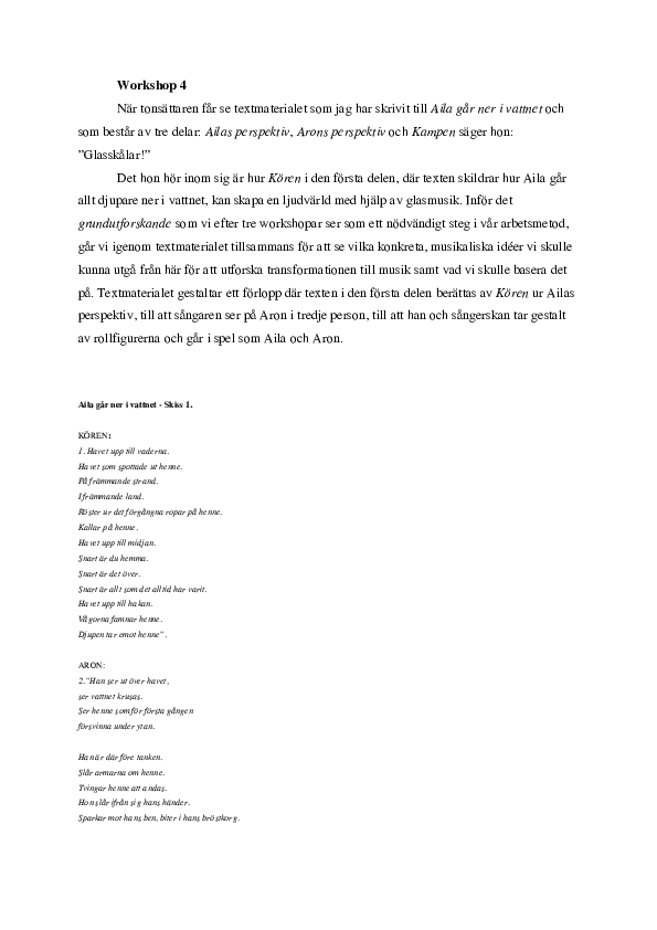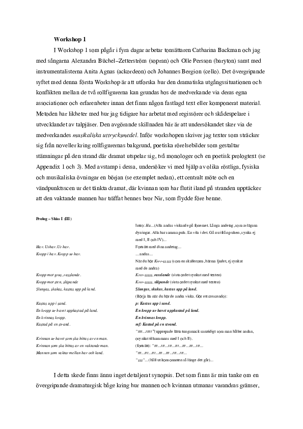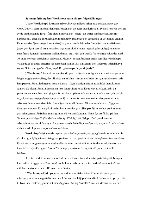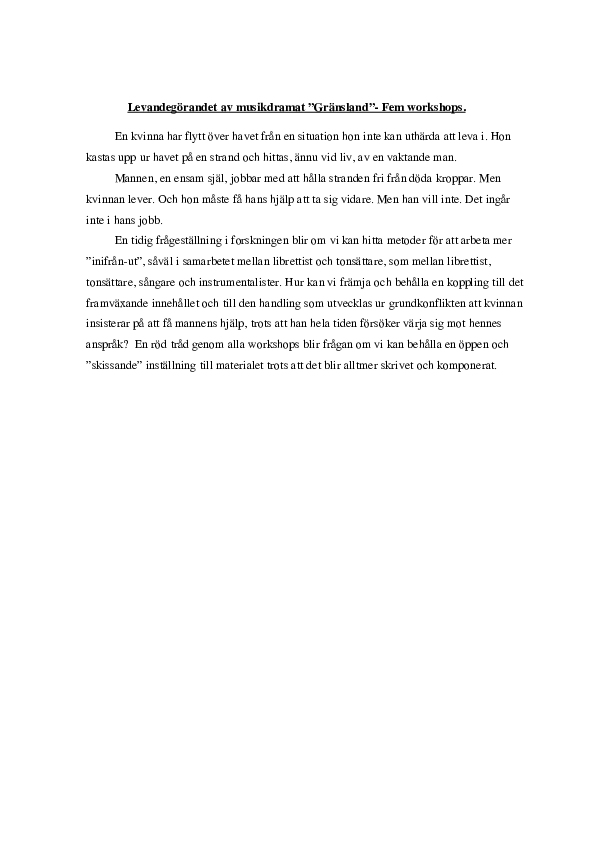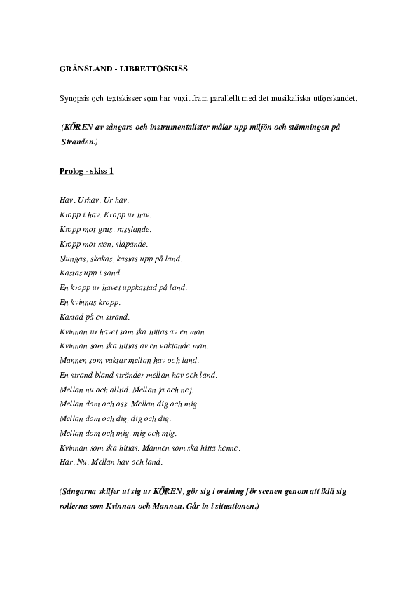 From the librettist’s perspective, the traditional working methods which tend to dominate in the creation of new music drama, often result in a situation where the initial intentions are lost along the way. How can we get away from a rigid methodology, where the different professionals involved in the creation of new music drama have to succumb to a procedure which can be likened to a whispering game? A procedure, where the dramatic content, rather than undergoing an emotional enrichment in its transformation into music, often loses the crucial connections to the initial intentions. This doctoral project aims to reach beyond the whispering game by seeking alternative working methods in the creation of a new music drama with the working title "Borderlands", circling around the subject matter of flight and borders - inner as well as outer. The research identified cross–border methods which, borrowing from the terminology of Martin Buber, can be seen as an attempt to counteract the “I–It” relationship that often results from the genre’s focus on virtuosity. The results might inspire further attempts to find alternative working methods which could ultimately create a stronger “I–Thou” relationship between the performance and the audience.