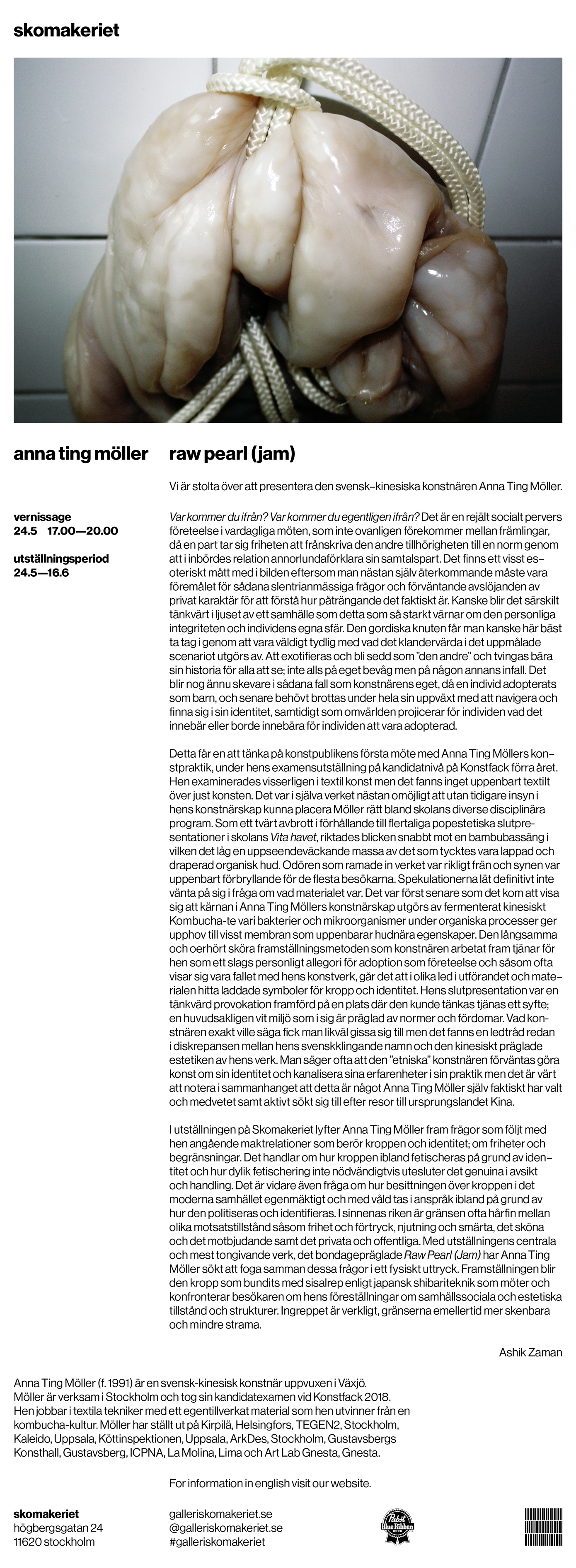 "I utställningen på Skomakeriet lyfter Anna Ting Möller fram frågor som följt med hen angående maktrelationer som berör kroppen och identitet; om friheter och begränsningar. Det handlar om hur kroppen ibland fetischeras på grund av identitet och hur dylik fetischering inte nödvändigtvis utesluter det genuina i avsikt och handling. Det är vidare även fråga om hur besittningen över kroppen i det moderna samhället egenmäktigt och med våld tas i anspråk ibland på grund av hur den politiseras och identifieras."